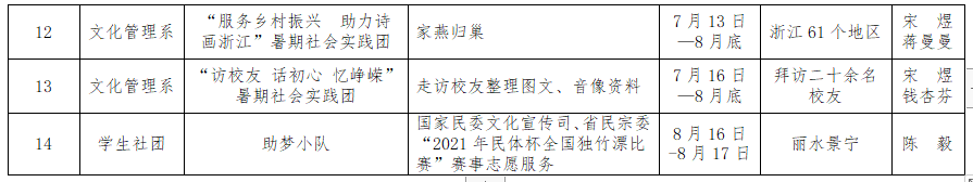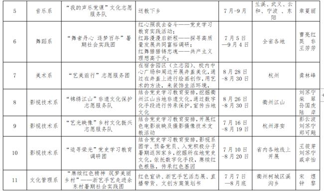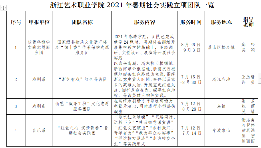 经各院系申报,校青年教学实践志愿服务团国家级非物质文化遗产楼塔“细十番”传承保护志愿服务团;戏剧系“浙艺有戏”红色寻访小队、“演绎工坊”文化志愿服务团队;音乐系“红色之心 筑梦青春”暑期社会实践团、“我的声乐党课”文化志愿服务队;舞蹈系“舞者丹心 逐梦百年”暑期社会实践团;美术系“艺美前行”志愿服务团;影视技术系“锦绣江山”非遗文化保护志愿服务队、“艺光映像”乡村文化振兴志愿服务队、“追寻荣光”党史学习教育调研团;文化管理系“赓续红色精神 筑梦美丽乡村”——浙艺手艺走进余东村暑期社会实践团、“服务乡村振兴 助力诗画浙江”暑期社会实践团、“访校友 话初心 忆峥嵘”暑期社会实践团;学生社团“助梦小队”等14支团队400余名师生将赴全省各地开展实践工作,引导青年师生深入基层一线受教育、长才干、作贡献,读好“无字之书”,展现浙艺风采。