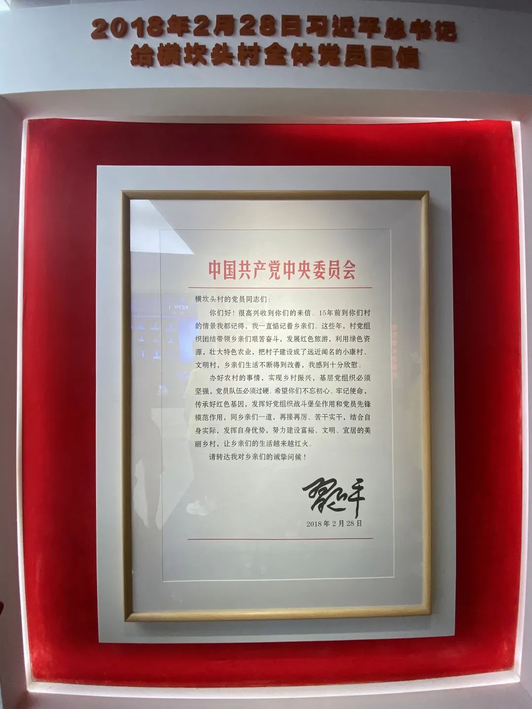 第二站红色寻访队来到“浙东红村”——横坎头村,参观走访了横坎头村村委,村史展厅。在余姚四明山革命老区,山多坡陡的横坎头村曾作为浙东抗日根据地的“心脏”。横坎头村不仅是历史红村,更是全国乡村振兴样板村,除了发展红色旅游,还发展特色绿色产业,村里的半山樱桃园是梁弄樱桃产业的鼻祖,还有竹笋、蓝莓、猕猴桃、大糕等特色农副产品。除此之外,横坎头村最出名的莫过于习近平总书记的两封回信。2003年,时任浙江省委书记的习近平在第一次回信后,2018年2月28日又再次回信,习近平总书记勉励横坎头村全体党员,希望他们同乡亲们一道,再接再厉、苦干实干,努力建设富裕、文明、宜居的美丽乡村。在总书记的勉励下,横坎头村打造红色旅游,发展绿色经济,村民越来越富,村庄越变越美,产业也越来越兴旺,2021年横坎头村党委获评全国先进基层党组织。