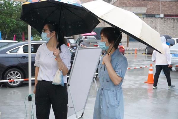 在濛濛细雨中,校领导来到报到现场关心慰问新同学并鼓励同学们:希望21届新生们好好利用大学时光,学有所成,学有所用。并且能在大学交到新的朋友,和老师融洽相处,处理好人际关系,度过美好的三年大学时光。