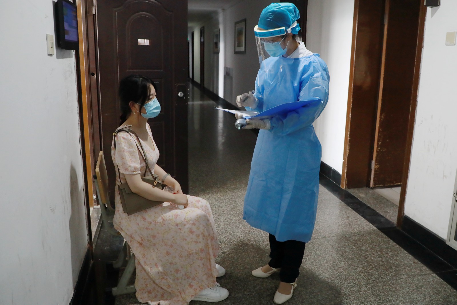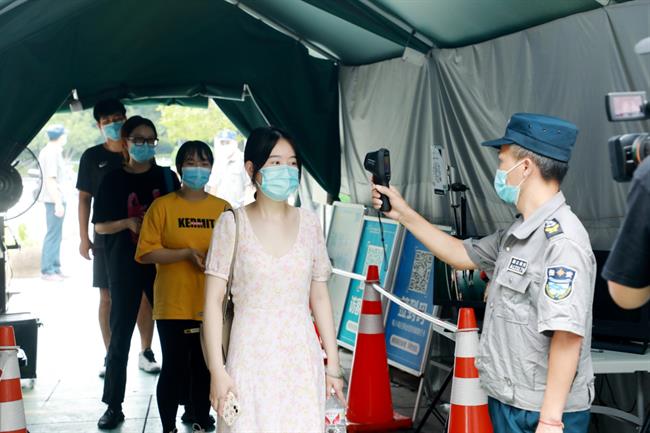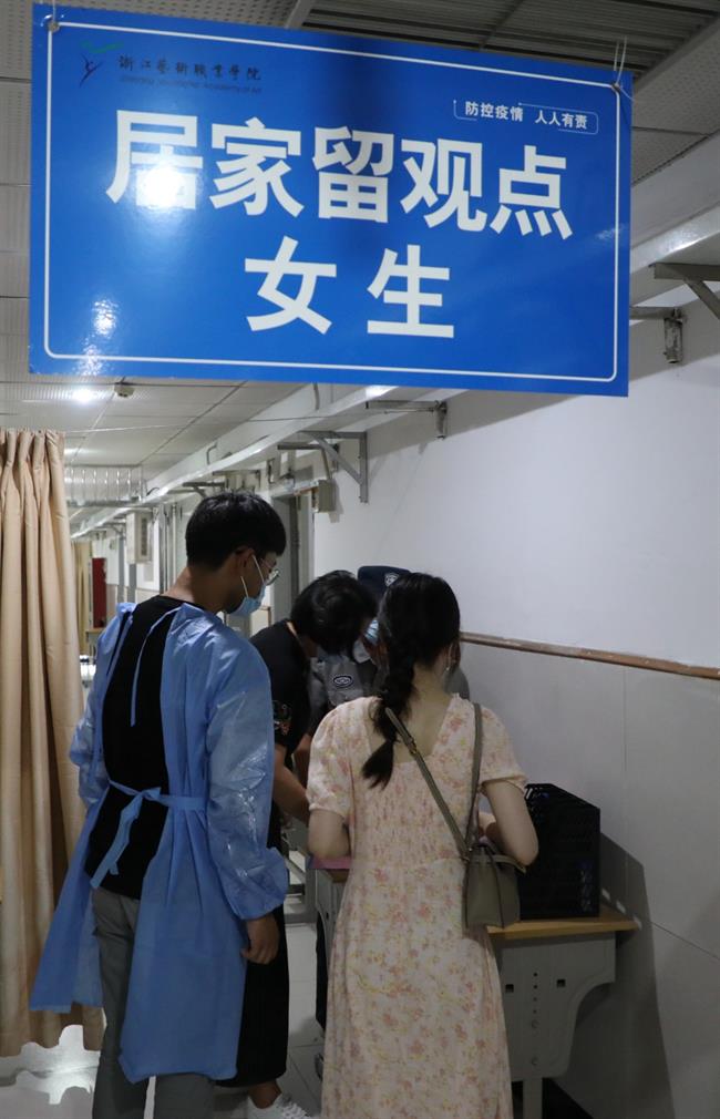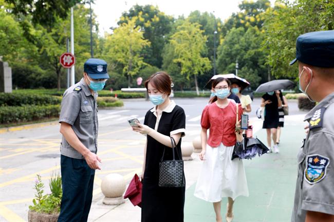 新入职教师扮演刚入学报到的大一新生,在学校门口排队,前后相互间隔一米距离,向保安出示健康码、行程卡和进校码并测量体温,体温正常者进入校园。一名教师在接受检测时模拟体温超过37.3°C,身着防护服的工作人员迅速将他带到校门口的临时隔离区,校医就其14天内旅居史、途径史、接触史、健康状况等做详细询问,并再次进行复查。