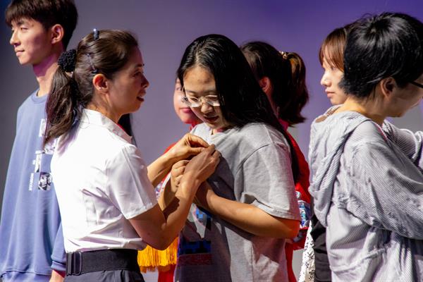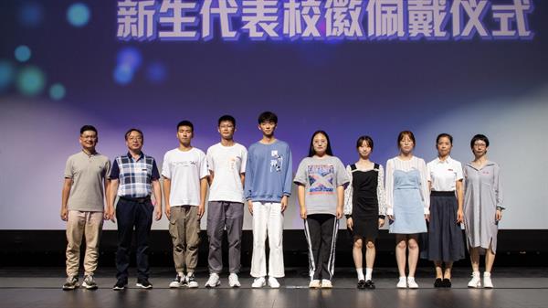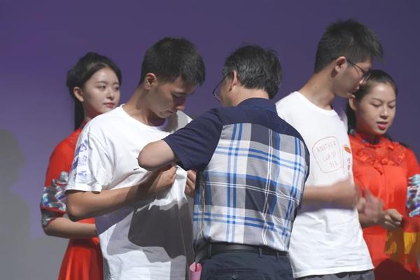 开学典礼在庄严的国歌声中拉起序幕,由影视大家庭的“家长们”为新生代表佩戴校徽。