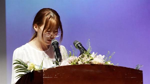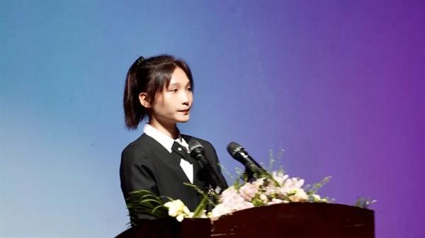 19摄影摄像1班的章紫晶回望大学生活,给新同学们提出几点建议。第一,学会真诚;第二,学会成长;第三,把握现在,并祝愿各位新生能在一次次坚持中逐渐认识自己、找到自己。21影视多媒体1班的潘子怡作为新生代表发言并和全体新生共同许下庄严承诺:我们会成长为一名有主见、有担当的浙艺影视人!