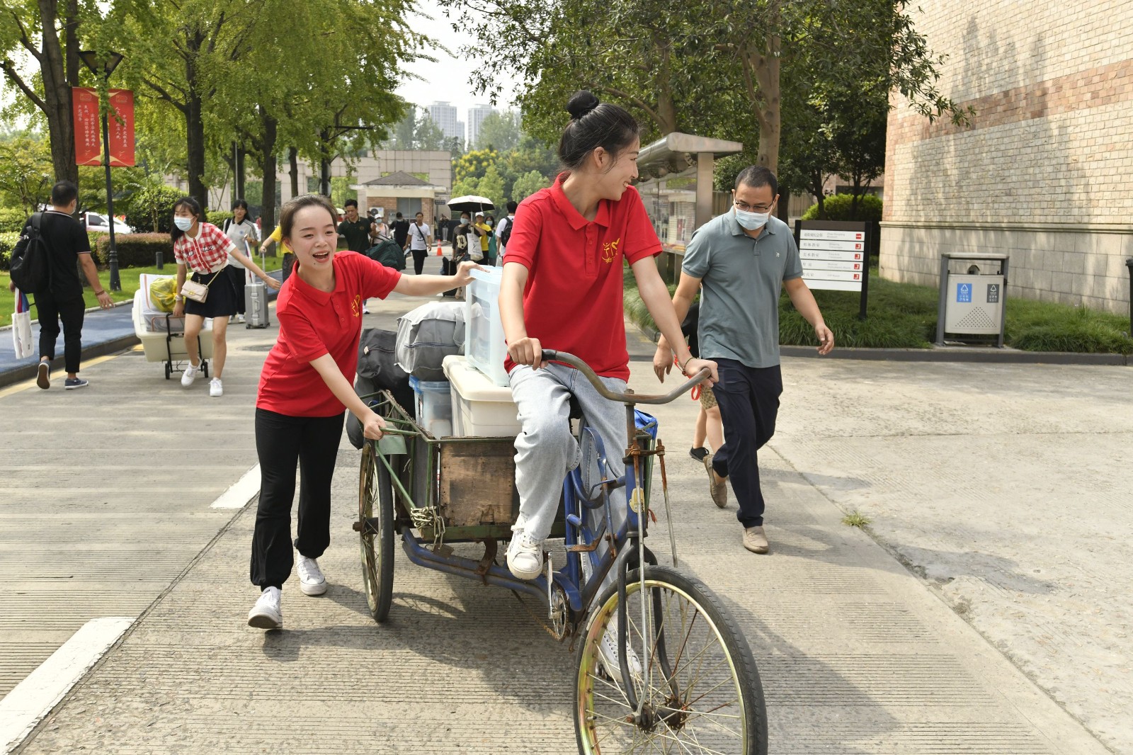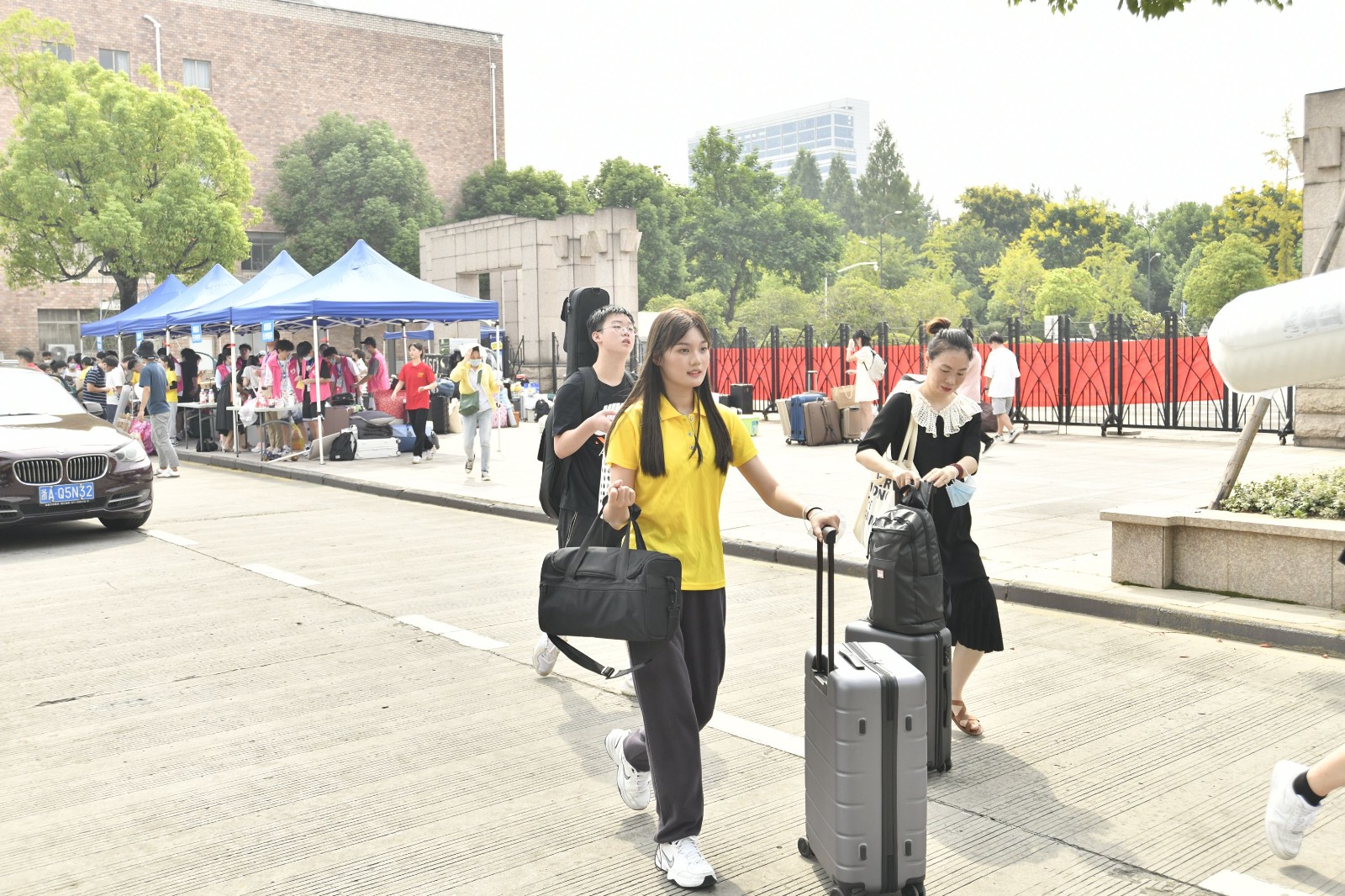 一大早,学校里热热闹闹,各院系书记、辅导员、新生班主任们在报到处迎接新生们的到来。新生们按照报到流程,由一名家长陪同入校,分别到所属院系进行报到,在五号楼报到处,验证录取通知书、办理户口迁移、购买床上用品、办理公寓固话家校通等。