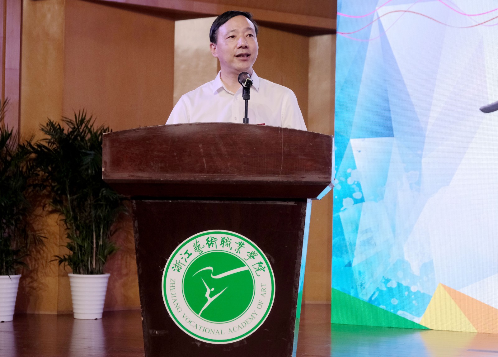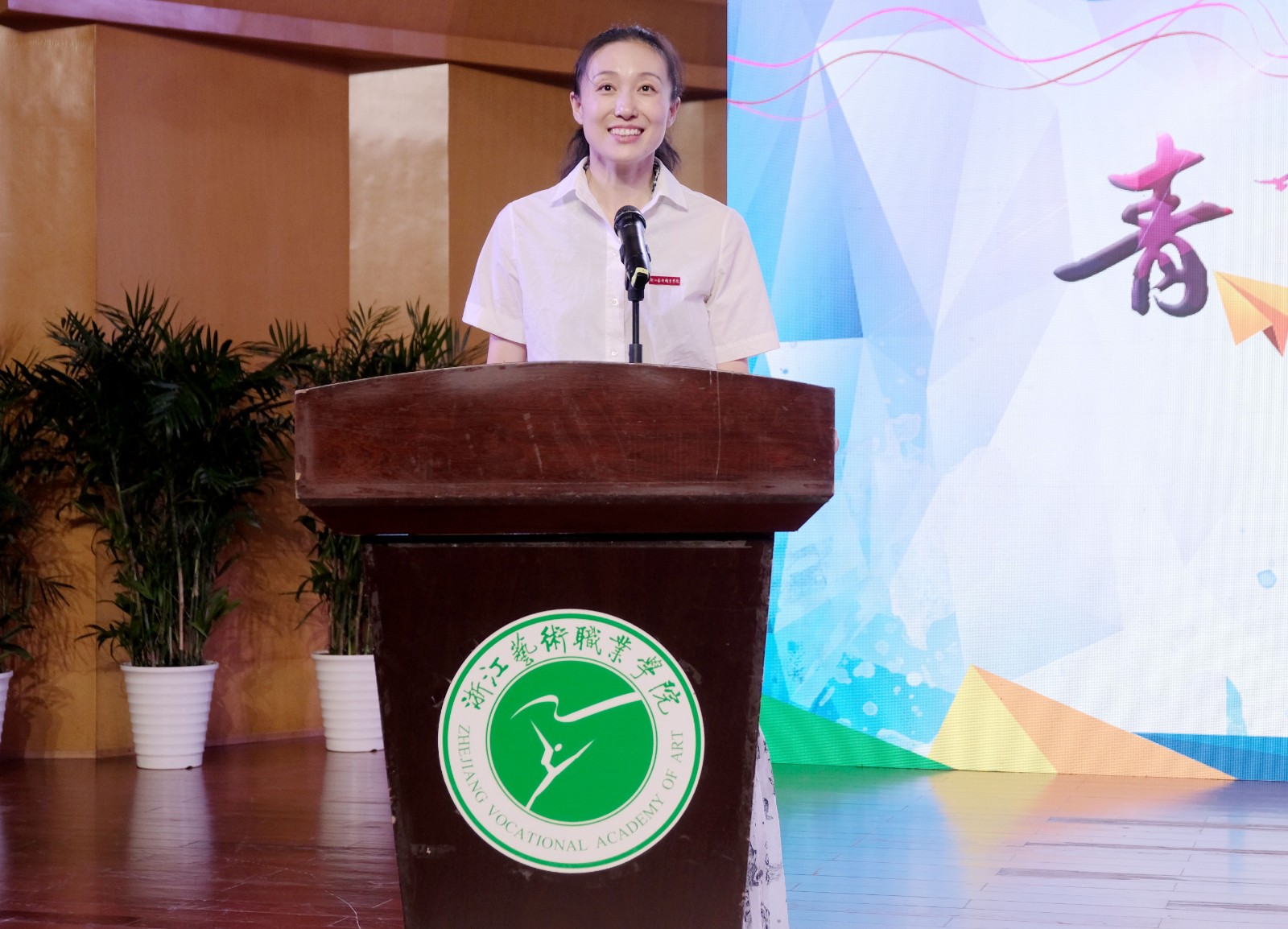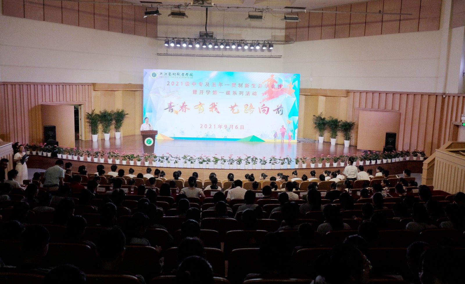 薛亮讲话,他向新生们的到来表示欢迎,介绍了学校辉煌的发展历史。培养德智体美劳的社会主义建设者和德艺双馨的艺术人才是省委、省政府赋予学校的使命。他希望新生们争做德艺双馨的浙艺人,为自己的艺术梦想注入理想信念。秉持勤学苦练的艺术追求,在舞台、实训室刻苦训练。树立团结友爱的优良作风,有困难及时提出,成为浙艺大家庭里最快乐、最和谐的集体。