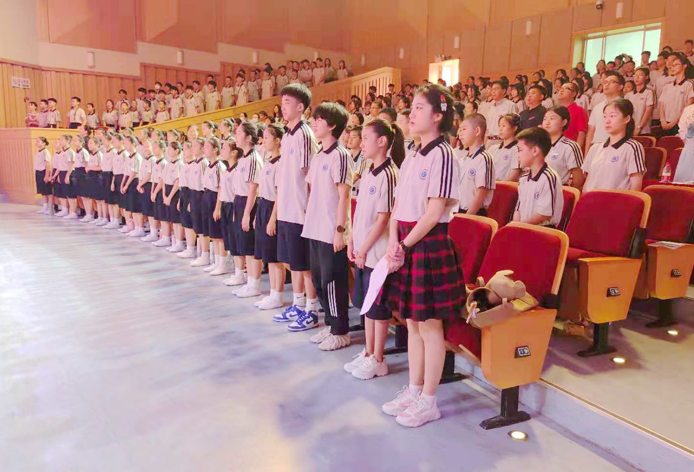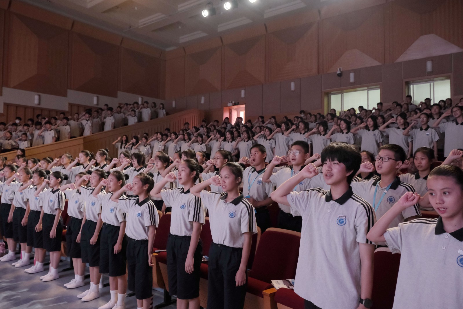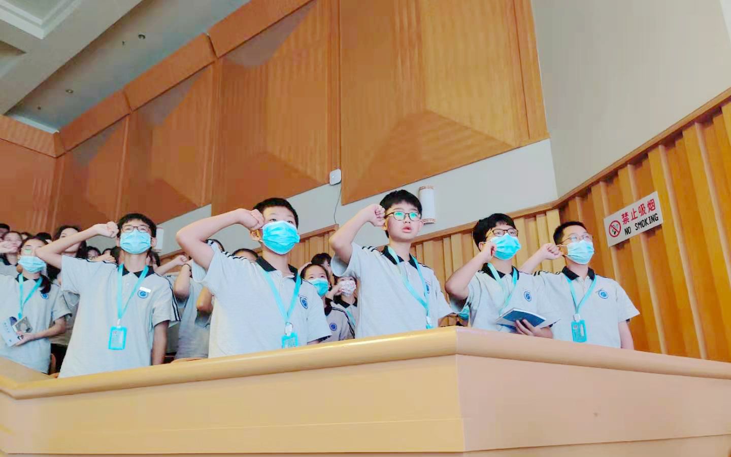 现场,校领导为新生代表佩戴校徽。全体新生齐唱国歌,观看学校宣传片,集体宣誓。