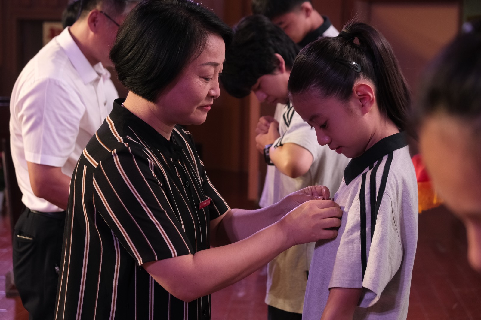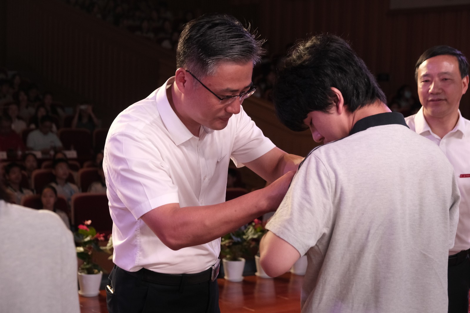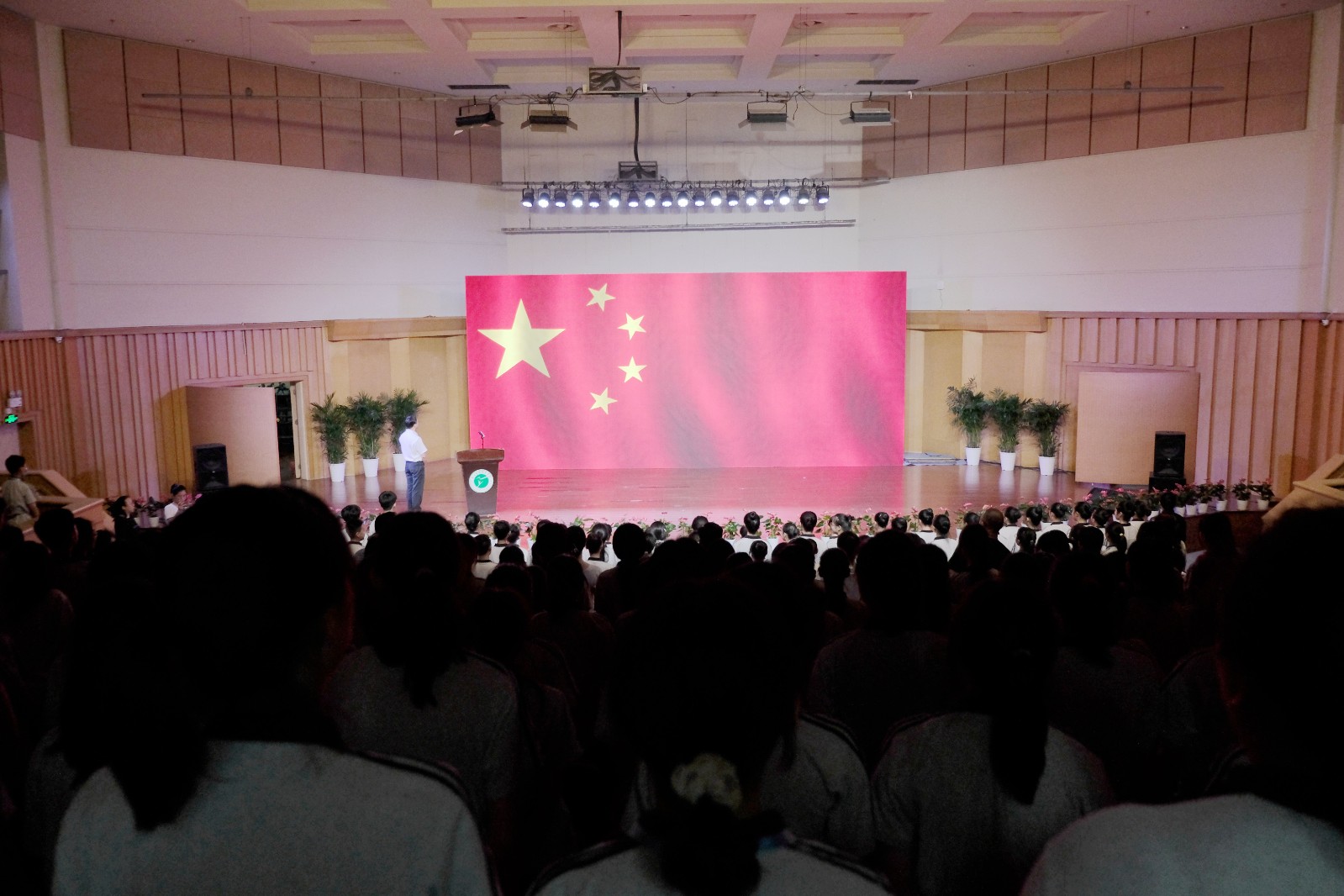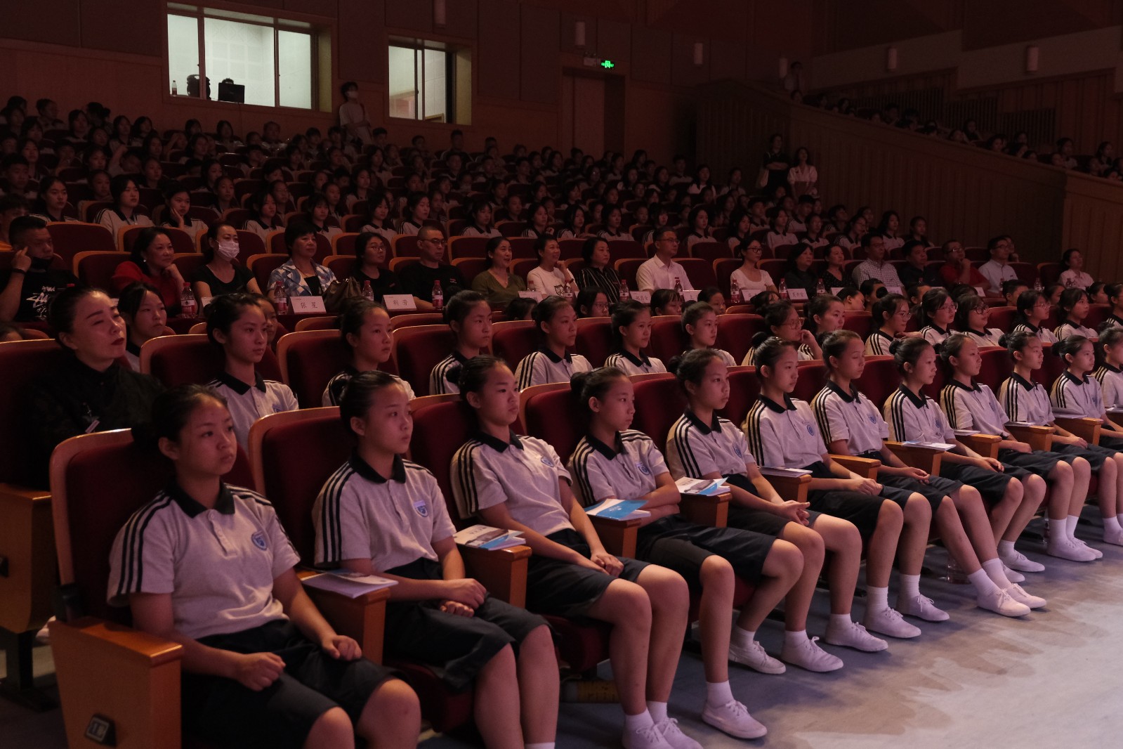 现场,校领导为新生代表佩戴校徽。全体新生齐唱国歌,观看学校宣传片,集体宣誓。