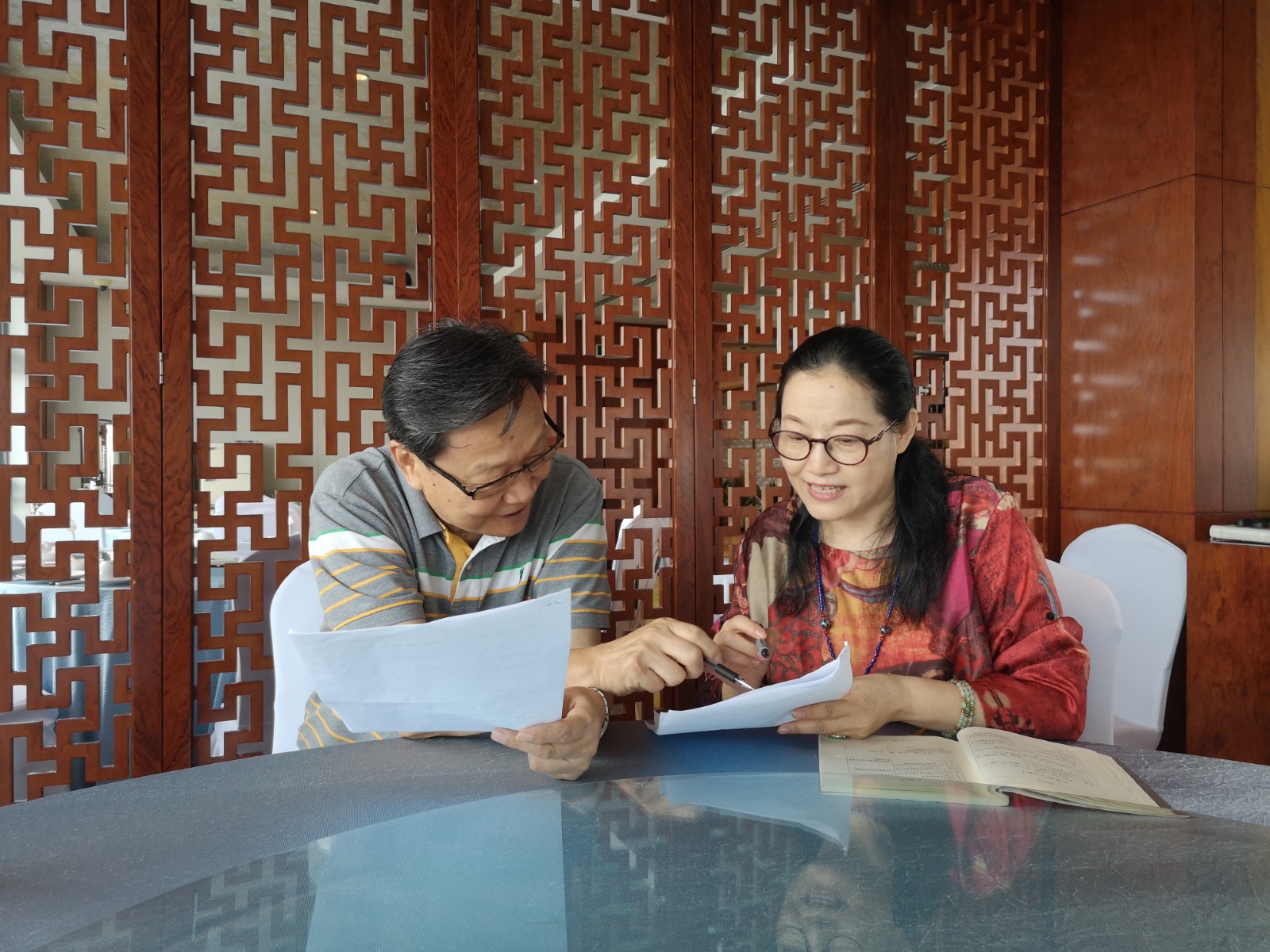 ▲与越剧语音专家周冠均请教、探讨语音问题