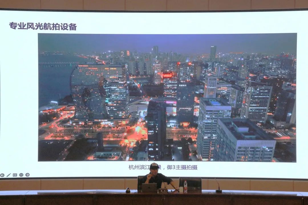 张力现场展示的一张张用无人机拍摄的风景和城市大片,让大家享受了一场视觉盛宴,带领大家走进了航拍的世界。讲座中关于“诗画江南,活力浙江”的视频案例,更是让大家领略了浙江得天独厚的自然风光与传承千年的浪漫诗情。最后,他希望同学们能主动了解行业前沿资讯、学习相关知识,勇敢尝试无人机拍摄,在实践中领略航空拍摄的魅力。