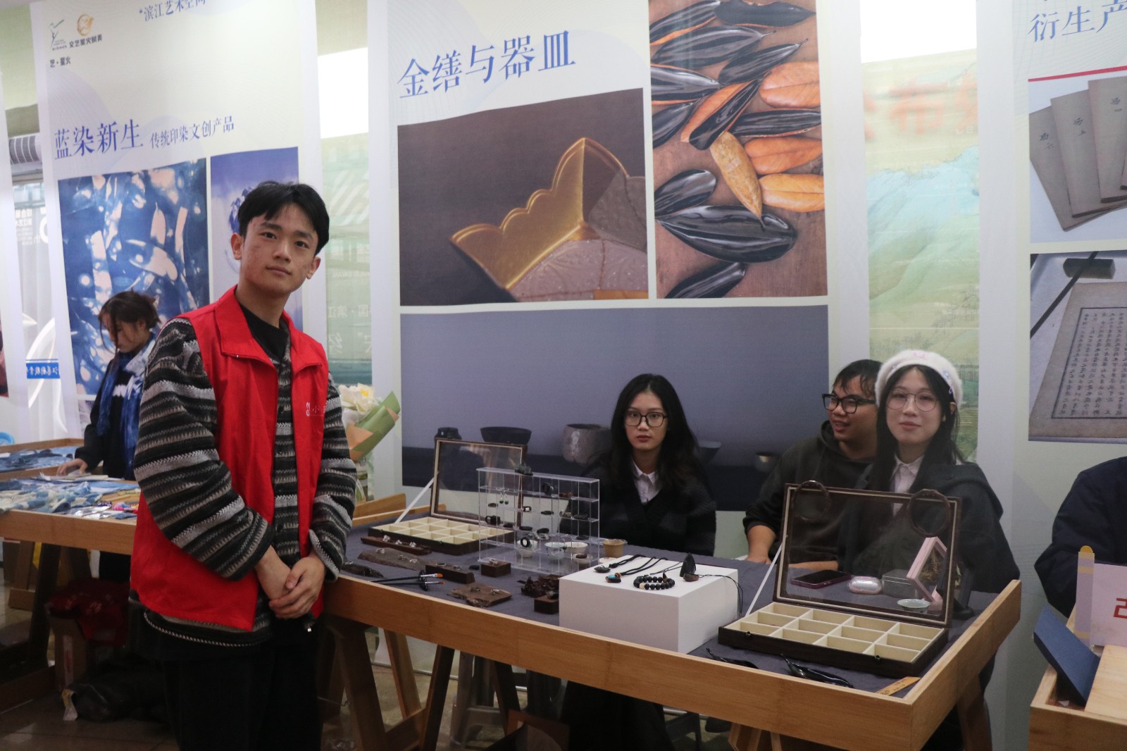 来到“蓝染新生”和“青瓷镌刻”摊位,大家在蓝色海洋中又感受到了不同的非遗文化。民族传统技艺专业的同学们以扎染的手法制作出的包包和雅致的耳环与方巾,用专业的技术传承与延续青瓷文化,一件件器物散发独具匠心的美感。