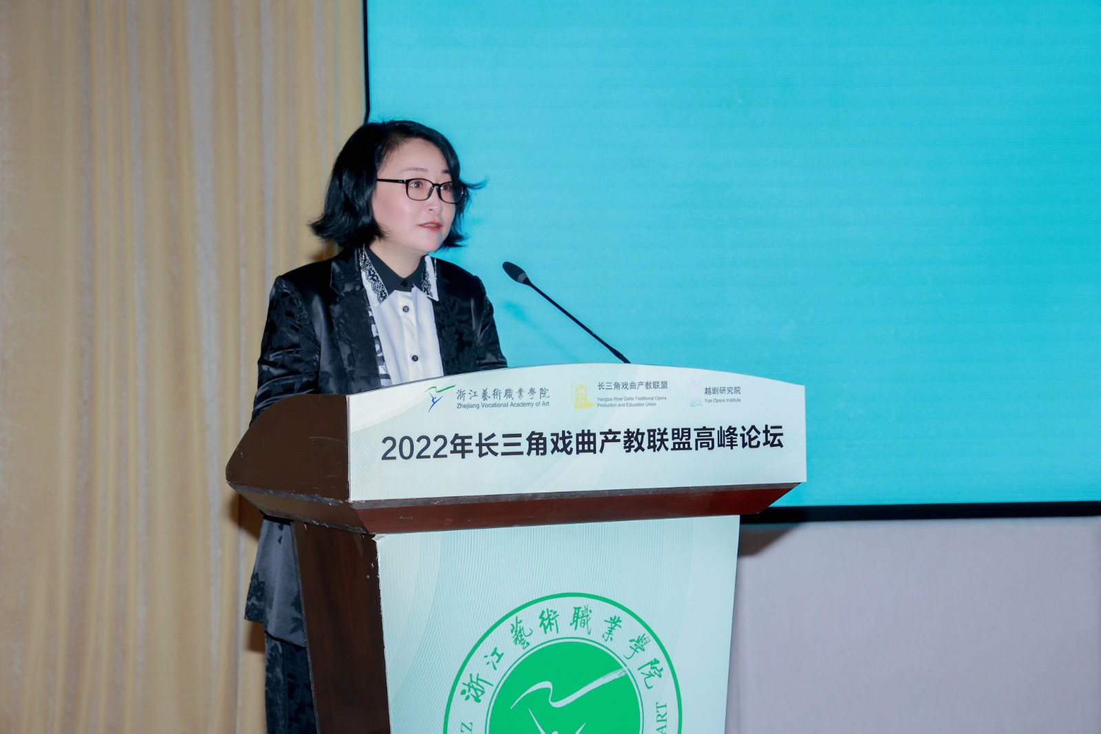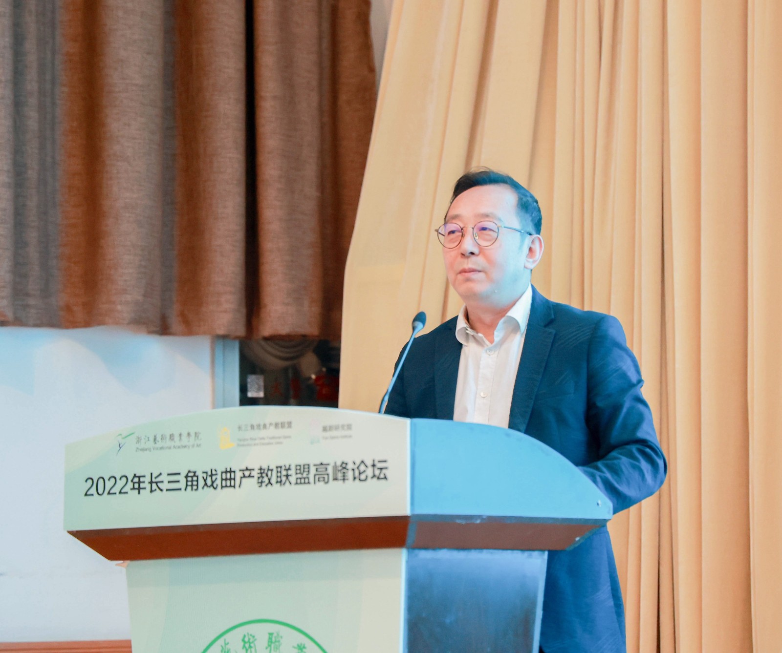 刁玉泉作讲话,他对前来参加高峰论坛的嘉宾表示欢迎,对论坛的成功举办表示祝贺。他强调,戏曲是中华民族的精神家园,与广大人民群众有割舍不断的情感联系,让戏曲在新时代焕发新的光彩,是广大戏曲人的不懈坚守和职责追求。对于长三角戏曲产教联盟,他提出三点希望:一是重心要更加积极地向中心靠拢;二是成果要更加积极向示范提升;三是品牌要更加积极向全域打造。