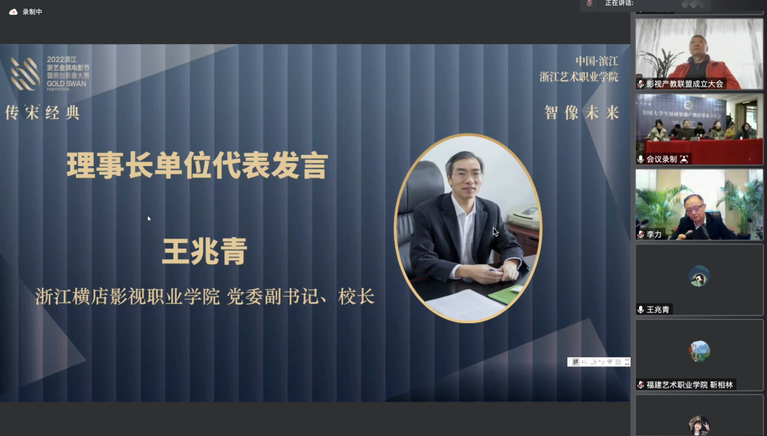 王兆青代表联盟理事长单位在发言中表示,全国大学生原创影像产教联盟的成立是推动《职业教育法》《关于促进新时代文化艺术职业教育高质量发展的指导意见》的落地之策、务实之举。作为联盟的理事长单位将按照联盟章程的规定积极参与联盟组织的各项活动,履行职责和义务,充分发挥学校在职教集团中的作用,进一步加强专业建设,不断探索新的人才培养模式,努力提高办学水平,与大家一道携手共创联盟的美好未来。