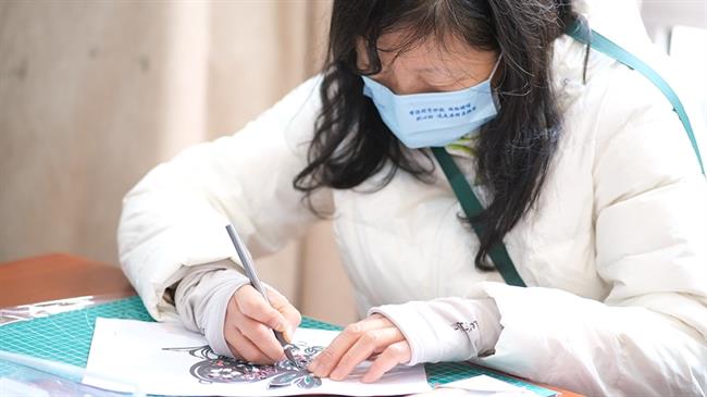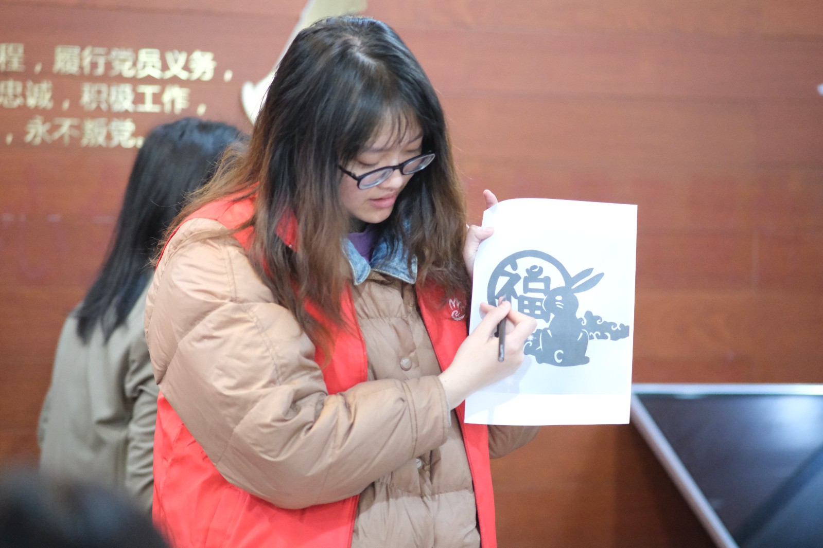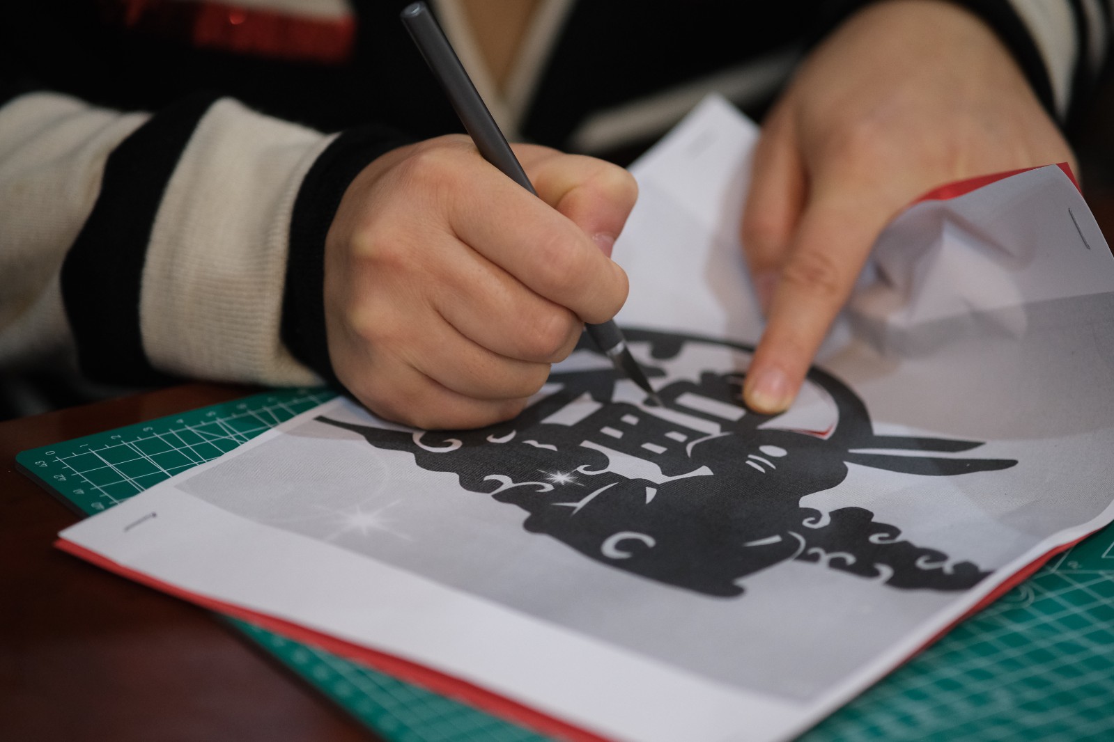 剪纸教学活动伊始,手工艺师生讲解了剪纸工具、制作过程与注意事项。以党的二十大和新年生肖兔为主题模板,学员们聚精会神,耐心把握好刻刀力度,仔细刻画自己的作品,在其中体悟剪纸的艺术魅力和乐趣。