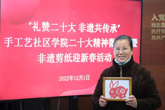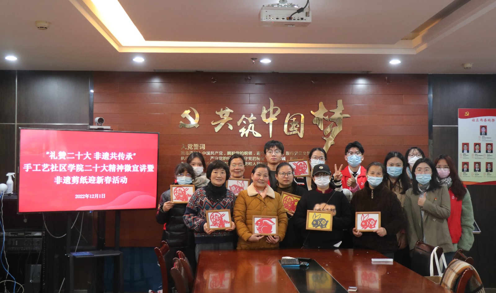 为深入学习宣传贯彻党的二十大精神,助推非遗的传承与发展,12月1日,手工艺师生走进与东信社区联合打造的“手工艺社区学院”,开展“礼赞二十大 非遗共传承”手工艺社区学院二十大精神微宣讲暨非遗剪纸迎新春活动,筑牢居民文化精神根基,宣传非遗文化的独特魅力。
