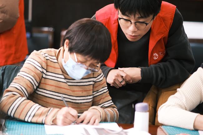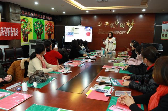 手工艺师生带领手工艺社区学院学员开展非遗剪纸迎新春教学活动。中国剪纸是一种用剪刀或刻刀在纸上剪刻花纹,用于装点生活或配合其他民俗活动的民间艺术,其传承赓续的视觉形象和造型模式蕴含了悠久的中国传统文化历史,寄托人们丰富的情感。