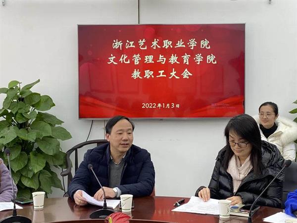 2022年1月3日,浙艺文化管理与教育学院第一次全体教职工大会召开,校党委副书记夏开堂,党委委员、组织部部长刘杨,人事处、教务处、学工部负责人,二级学院领导班子和全体教职工参加。