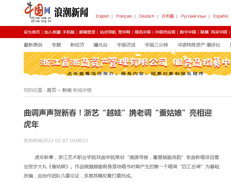 中国网浪潮新闻:曲调声声贺新春!浙艺“越娃”携老调“蚕姑娘”亮相迎虎年
