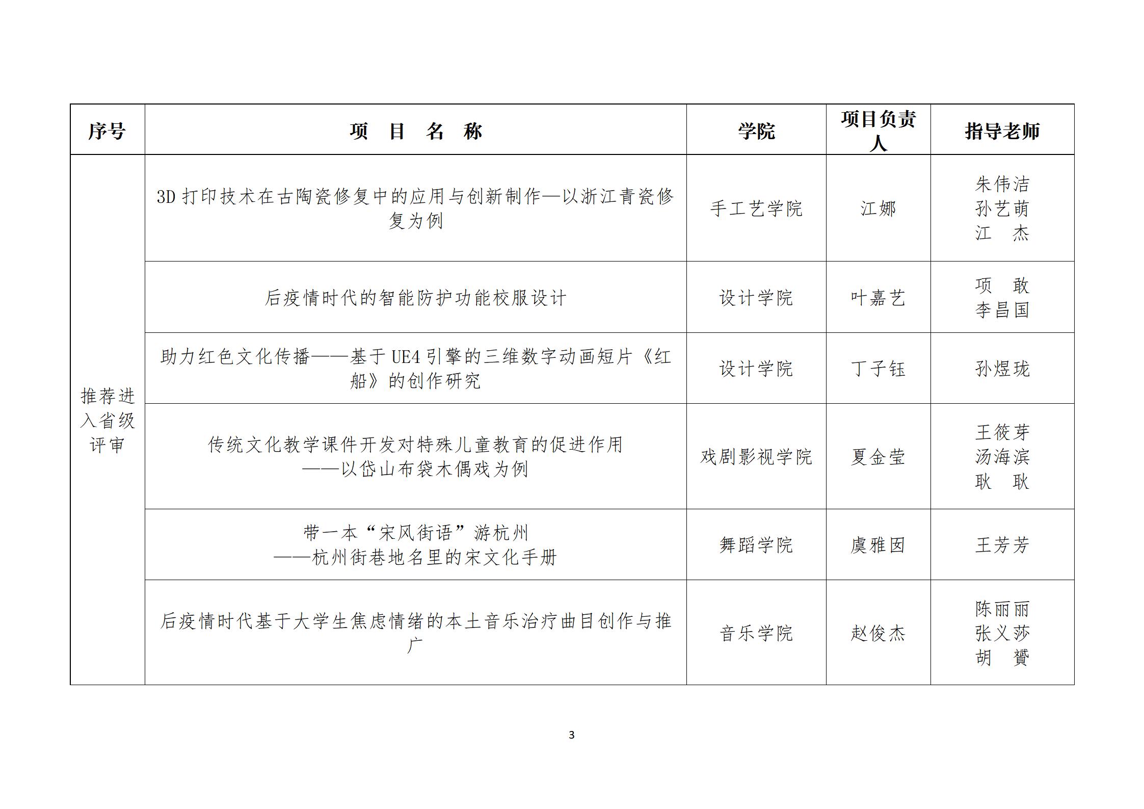 关于推荐手工艺学院《3D打印技术在古陶瓷修复中的应用与创新制作—以浙江青瓷修复为例》等6个项目进入2022年度浙江省大学生科技创新活动计划(新苗人才计划)项目省级评审、确定戏剧影视学院《非遗传承·莲花薪传——曲艺舞台剧编创》等6个项目为校级立项的公示