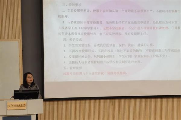 许瑛通报了开学以来公寓卫生、安全检查等情况,带领同学们一起重温学生手册,对中专学生管理“四禁”、违纪处分、文明寝室建设等内容进行重点学习与讲解。她表示,希望同学们思考清楚“为什么来学校”“来学校做什么”两个问题。一是做到心存敬畏之心,常怀感恩之心;二是做到律己、谨言、慎行,规范行为,养成良好的学习生活习惯;三是做到自觉遵守防疫要求,发挥寝室网格长作用,筑牢安全防范网。