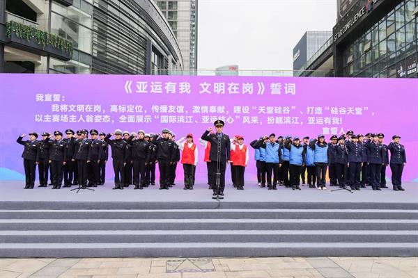 “我将文明在岗,高标定位,传播友谊,激情奉献...”戏剧影视学院学子作为志愿者代表参与《亚运有我 文明在岗》宣誓。
