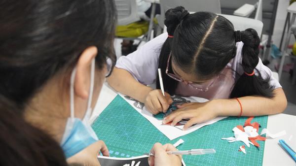 木刻韶年,水印芳华。手工艺学子现场示范绘、刻、印等一系列制作流程,将宣纸、木板和颜料巧妙融合,一幅幅精美的水印木刻版画跃然纸上,让孩子们连连感叹水印木刻的神奇。
