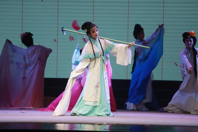 《芳菲》分为“萌蘖”“蔓蔓”“葳蕤”“桃夭”四个篇章,以此比拟学生们在戏曲文化的土壤中从新芽萌发到蓓蕾初绽的成长历程。小生剧目《白蛇传·断桥》《梁祝·回十八》《胭脂·慎思》,老生剧目《白兔记·回书》 《李娃传·责子》,花旦剧目《情探·行路》《打金枝·闯宫》《红楼梦·葬花》《血手印·法场祭夫》,老旦剧目《祥林嫂·问天》《杨门女将·巡营》《拾玉镯·春光春色春意浓》等轮番上演,节奏紧凑、精彩纷呈,浓缩了学生们4年所学,展示出她们在唱、念、做、打方面扎实的基本功,在角色塑造、剧目表演和戏曲编导等方面的综合能力。现场观众们的鼓掌声、叫好声不断,现场60多岁的市民胡女士说:“平时很难看到这么精彩的折子戏,这次带5岁的孙子一起来看,他整场都看得很入迷!”