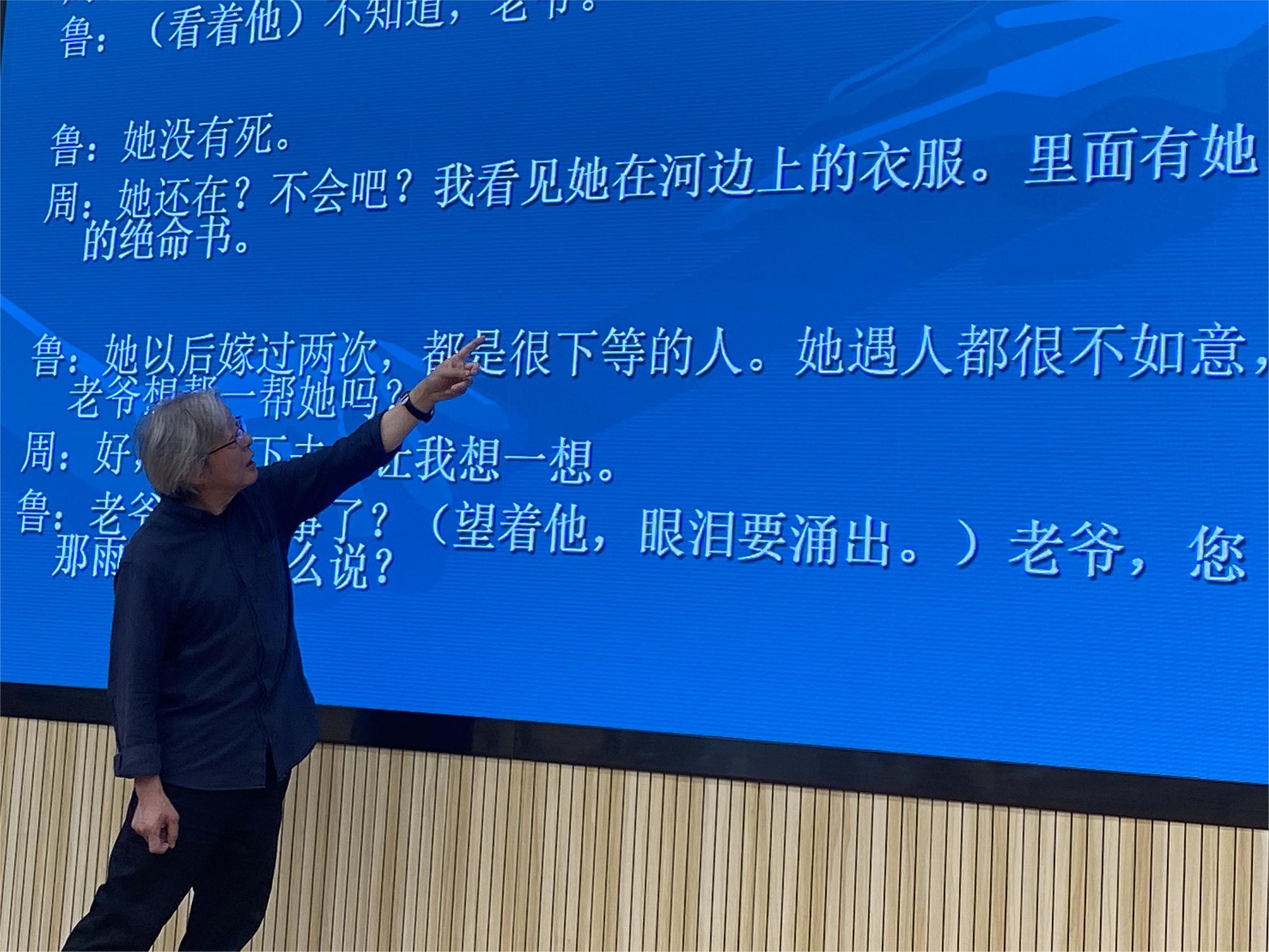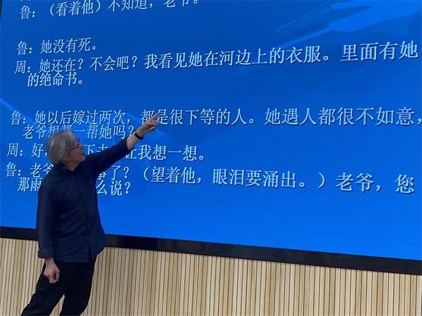 王晓鹰教授旁征博引、以例佐言,从场景布局、人物行为习惯等角度,为同学们解析《雷雨》中周朴园与鲁侍萍的关系——并非单纯的主仆或者昔日的旧情人关系,而是一对真正相爱过的恋人,使同学们透彻把握《雷雨》中的人物关系,深刻体悟剧中人物的命运感。剧本中的每一句话、每一个字都值得细细推敲。