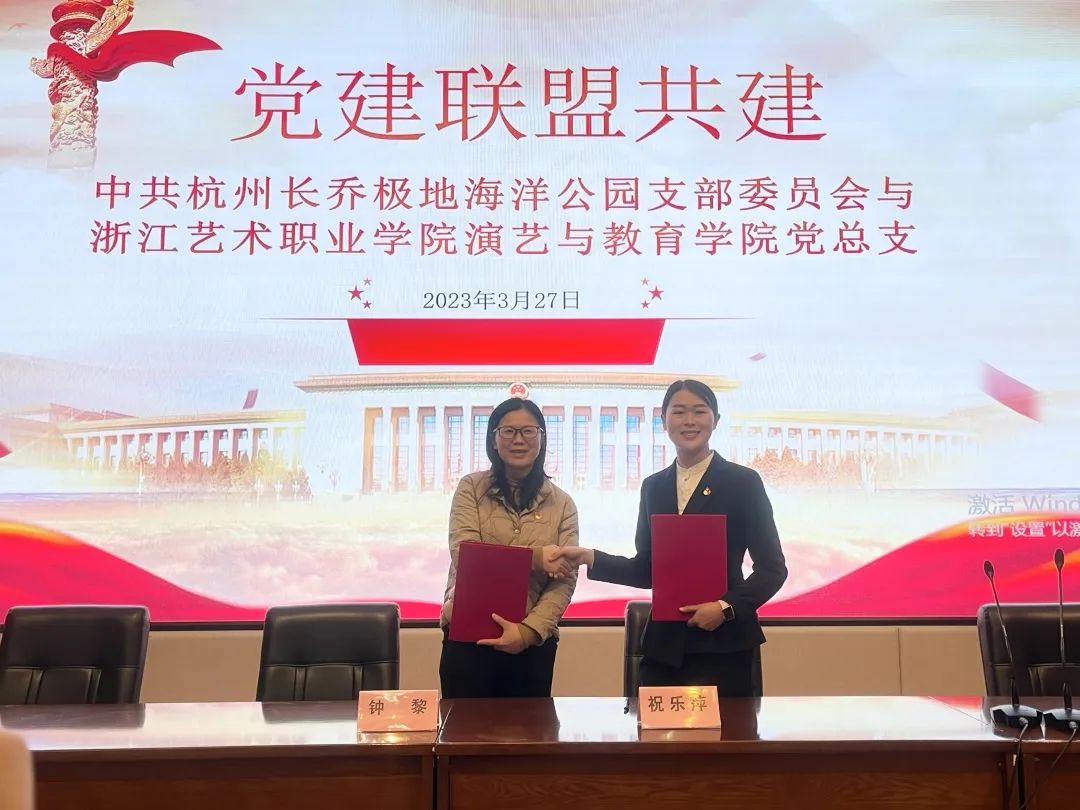 党总支专职副书记钟黎同长乔极地海洋公园支部委员会副书记祝乐萍共同签署了党建联盟共建协议,此次签约合作充分发挥了双方优势,为实现人才共培、成果共享、深入开展合作奠定良好的基础。