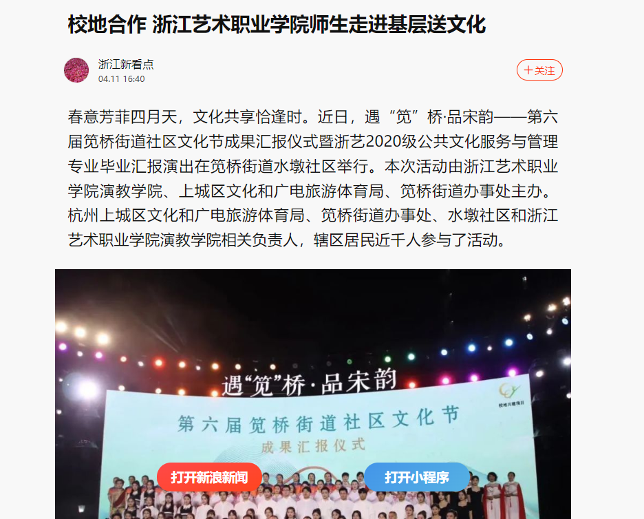 “人民在哪里,哪里就是中心;生活在哪里,哪里就是舞台。”本次笕桥街道社区文化节历时两个多月,2020级公共文化服务与管理专业80名同学在专业老师带领下,通过实地走访基层、深挖笕桥故事、回应需求呼声等方式,深入一线为群众开启文化点单定制服务。他们打造的社区文化节以笕桥特有的架空层文化空间为宋韵文化主要展示场景,分成“表演、歌舞、视觉”三个模块,开展培训比赛、手工体验、非遗研学等公益文化活动20余场次,惠及居民3000余人。真正实现社区文艺爱好者动起来、文化空间亮起来、文化活动火起来,将精神共富深植基层沃土,为基层群众打造文化满园花香。