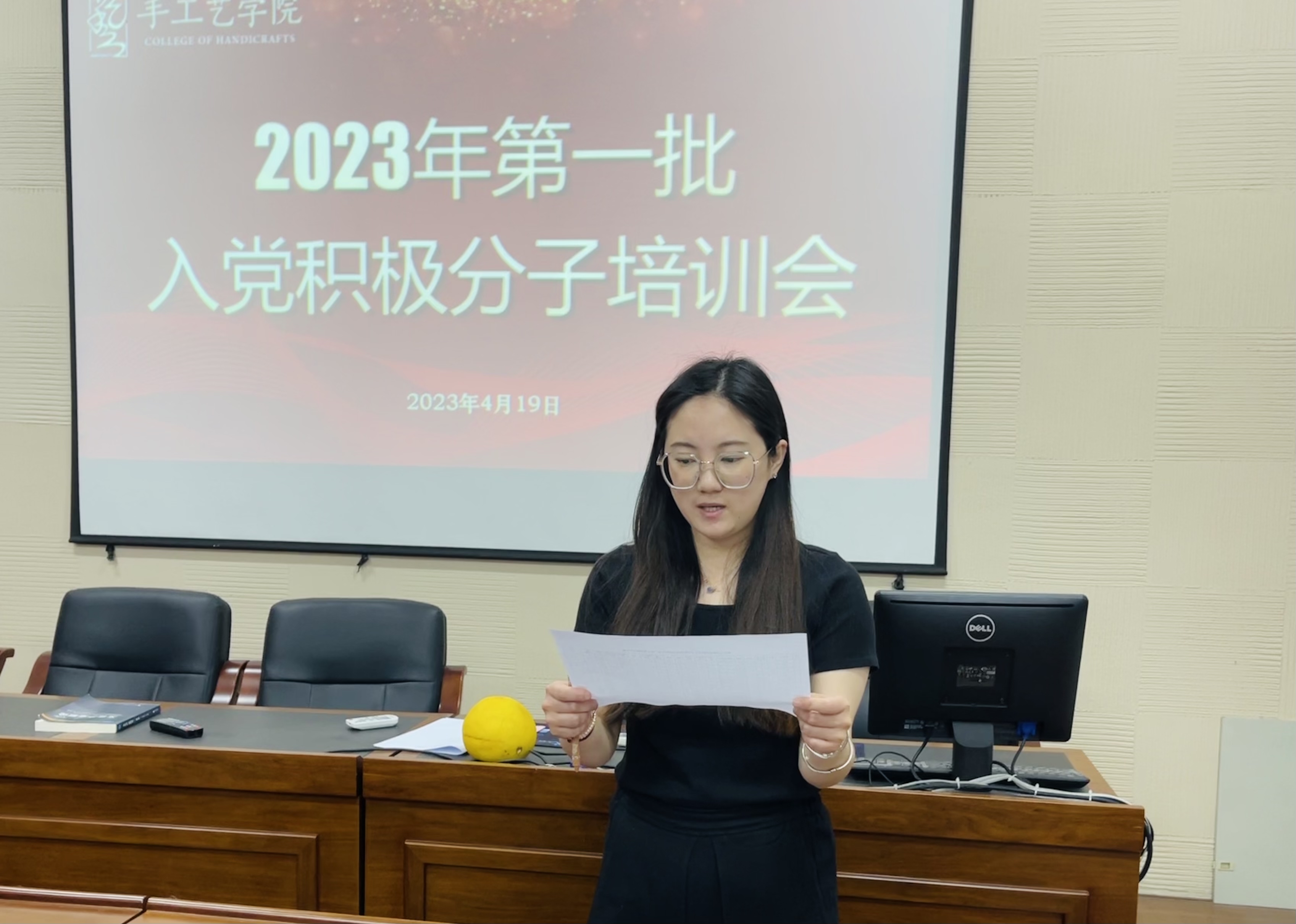 为进一步学习贯彻落实党的二十大精神,近日,手工艺学院在13101教室举行2023年第一批入党积极分子培训会。手工艺学院组织员钱杏芬、学生党支部书记胡墨智丽参会。
