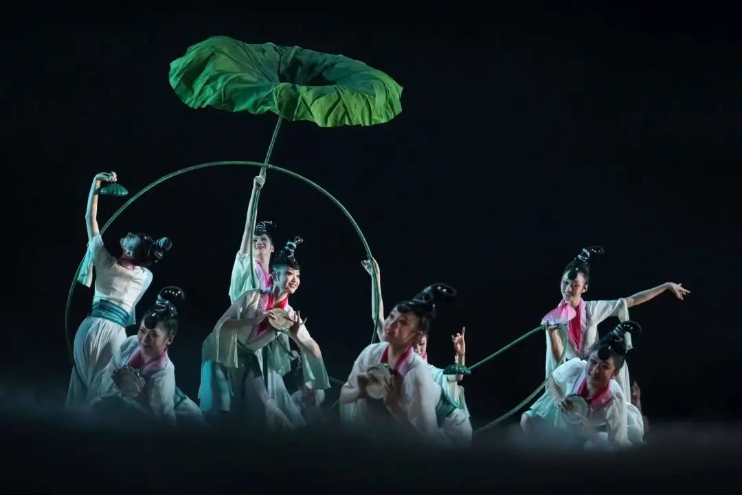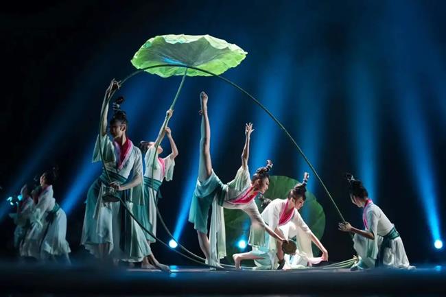 《莲鼓越歌行》源于浙江地域特色“水乡花鼓”,围绕着采莲女的生活风情和人物形象,塑造了一幅古代越地女子载歌载舞的动态画卷。