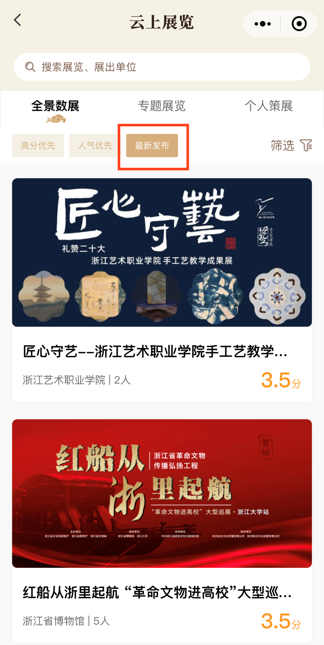 1.微信搜索进入“浙里文化圈”,点击“观展”栏目进入“云上展览”