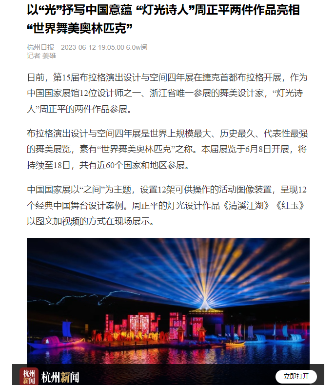 日前,第15届布拉格演出设计与空间四年展在捷克首都布拉格开展,作为中国国家展馆12位设计师之一、浙江省唯一参展的舞美设计家,“灯光诗人”周正平的两件作品参展。