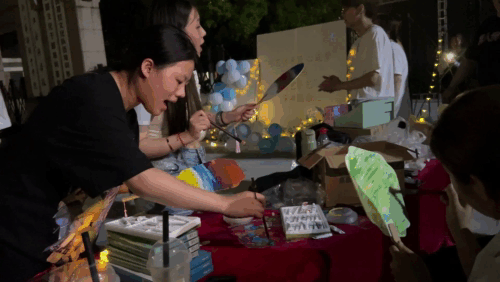 另一边,“浙艺手艺”节创意扇面绘画活动也在有序进行中,毕业生们和学弟学妹们一起用分发的绘画工具在扇面上尽情创作,画下的是自己的作品,描绘着的是对未来的憧憬,探讨、欢笑声不断。