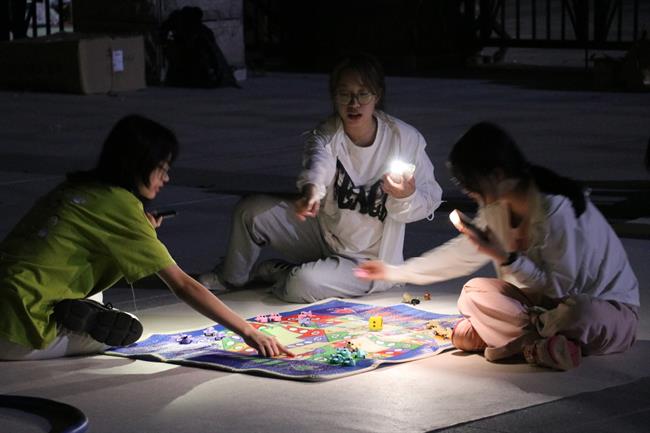现场布置了大型的飞行棋游戏区,同学们围坐在一起,扔骰子、走棋......玩得不亦乐乎,好不惬意。