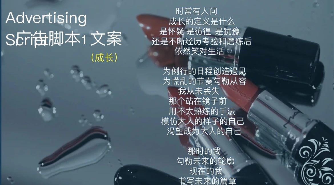 创意文案考核内容:为某款产品策划一套视频广告创意方案,目的是考察学生对广告脚本策划的创新能力和文字的把控能力。评分标准围绕着创意、文字、方案架构、逻辑表达、设计审美、主题内容、平面广告设计(额外加分项),共七个方面。