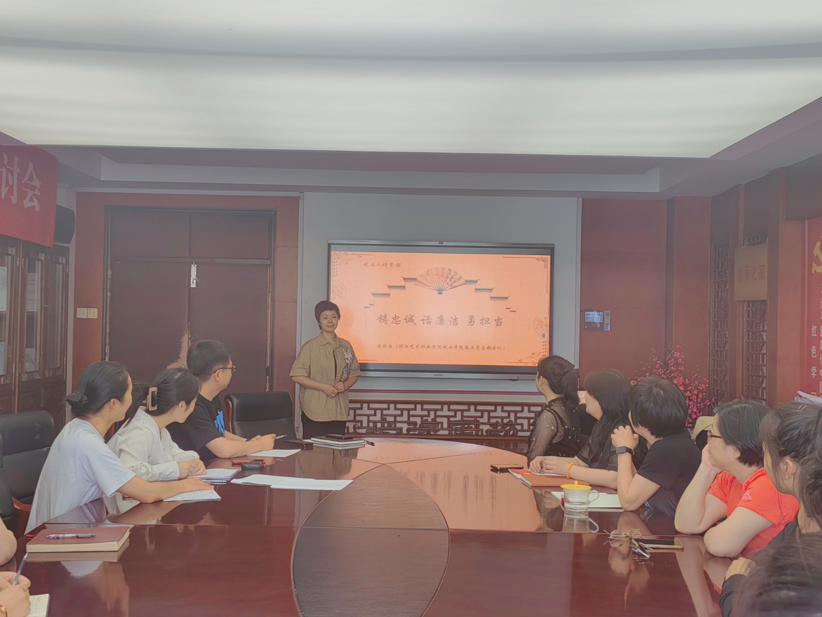 教工党支部书记柴轶佳上题为《铸忠诚 话廉洁 勇担当》专题党课。她从党的二十大报告提出的“坚持以严的基调强化正风肃纪”切入,从传承“黄龙精神”展开,以生动故事诠释浙艺戏曲教育工作者铸忠诚、学廉洁、勇担当的精神风貌和坚定信念。号召党员担负立德树人的使命任务,做好传承文章,彰显勤廉担当,秉承“守正创新、知行合一”的教学理念,心怀“国之大者”,立足传承弘扬中华优秀传统文化,努力做精于“传道授业解惑”的“经师”和“人师”,为繁荣发展中国戏曲事业,铸就社会主义文化新辉煌贡献力量。
