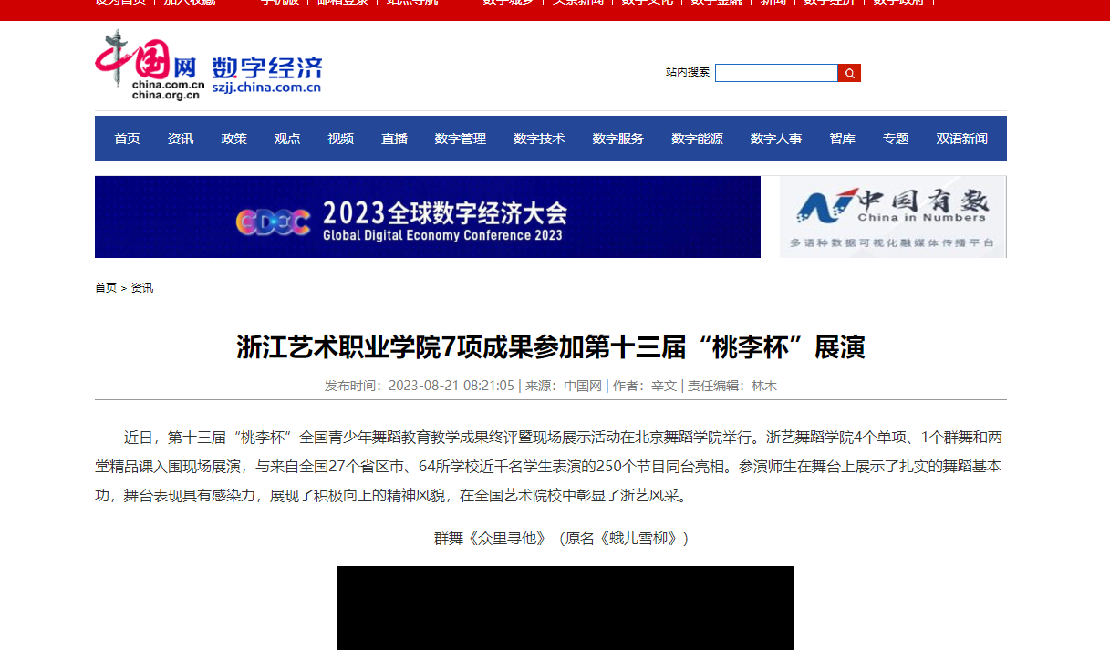 浙艺2017级舞蹈表演(中国舞)男班罗杨宇参赛作品《我的牧场》,2018级舞蹈表演(中国舞)女班许冰参赛作品《爱莲说》,2018级舞蹈表演(中国舞)男班凌子睿参赛作品《行者》,2019级舞蹈表演(中国舞)男班黄跃成参赛作品《书痴》,原创群舞《众里寻他》(原名《蛾儿雪柳》)和《景宁畲族舞蹈步伐训练》《前溪舞复建基础课》两堂精品课入围现场展演,入选数量位列全国同类艺术职业院校首位。