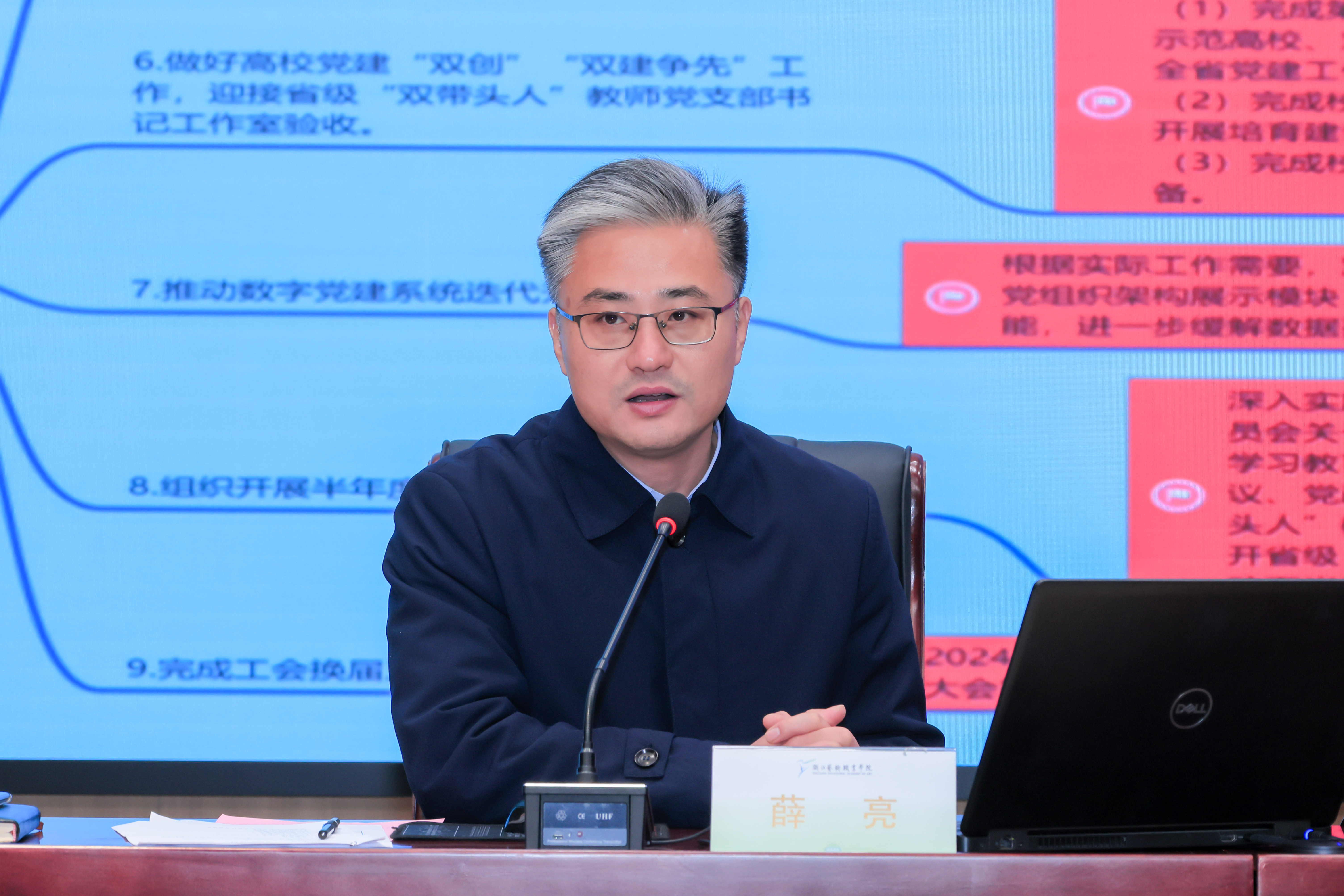 薛亮表示,2024年是实现“十四五”规划目标任务的关键之年,是学校第三次党代会擘画的发展蓝图启动之年,也是谋划“十五五”、加快新一轮高质量发展的全面推进之年,学校整体发展情况良好,但当前发展仍面临着一些困难和挑战,也有着难得机遇和许多有利条件,全校上下要准确把握形势,坚定信心决心,抓住重点、加力提速,抢抓机遇、乘势而上,聚焦工作重点,实现更大实破要聚焦核心目标,精准对标新双高申报条件,抓紧筹备、补强弱项聚焦立德树人,提升育人质量要聚焦人才工作,增强发展动能要聚焦社会服务,作出更大贡献要聚焦基础设施提质,拓展办学空间要聚焦深化改革,激发内生动力,汇聚全校合力,以重点带动全面,把发展规划一步步变成美好现实为建设中国特色高水平职业学校作出新的更大的贡献。