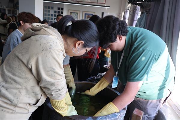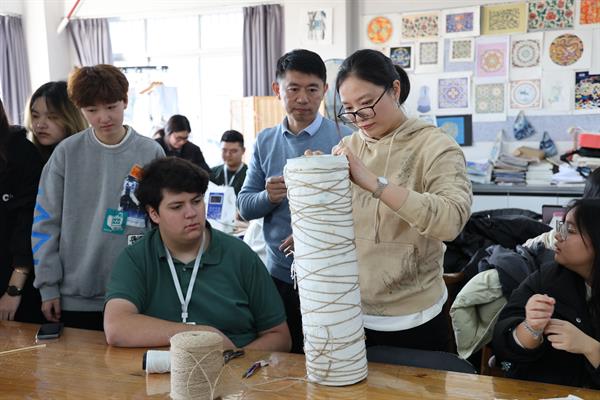走进扎染实训室,浓郁的艺术气息扑面而来。在专业老师的精心讲解下,美国学生们了解了扎染的历史渊源和技法特点,并在专业同学的协助下,他们拿起布料,运用各种扎结技巧塑造出独特的形态,再将这些扎好的布料逐一放入染缸中。经过一段时间的浸泡,颜色渐渐透进布料内部,当一块块布料再次展开时,原本普通的白色围巾布料瞬间焕发出了全新的生命力,每一块都有了独一无二的图案与色彩。美国学生们脸上满是开心与自豪的笑容。他们纷纷表示,此次体验不仅让自己深切感受到了中国传统艺术的魅力,也对中国文化有了更深入的认识。
