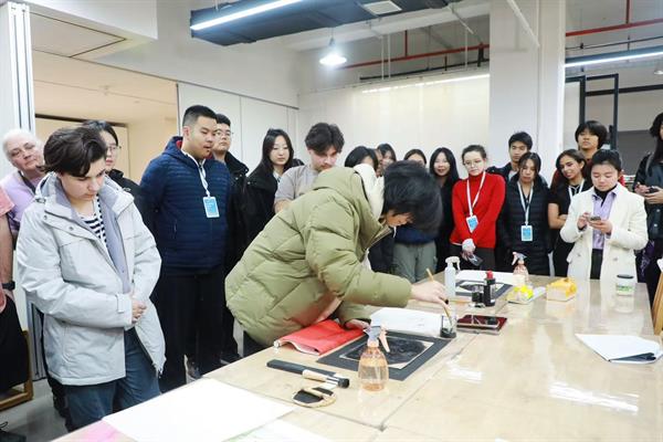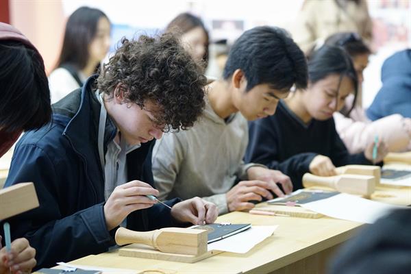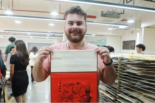 从文人笺纸的细腻雅致到民间年画的淳朴自然,水印木刻以其多姿多彩的魅力,深深吸引着人们的目光。在这次特别的课程中,同学们知晓了中国传统版画印刷技艺的悠久历史。在专业老师的耐心指导和专业同学的细致演示下,美国学生们现场体验了这一传统技艺。套色、对版、研磨拓印,每一步操作都充满了热爱和专注。经过一番精心制作,他们成功制作出了精美的水印木刻年历、年画和版画印刷品。看到自己亲手完成的作品,美国学生们赞叹不已,他们感受到了水印木刻技艺的神奇,也对自己的作品充满了成就感。