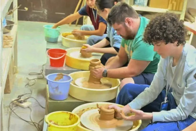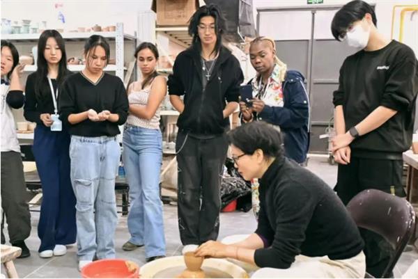 温暖的午后,同学们满怀期待踏入陶艺实训室,开启了青瓷制作之旅。空气中弥漫着泥土的芬芳,与窗外轻柔的微风交织成一首悠扬的序曲。在专业老师和同学的指导下,美国学生们将已经搓好的泥放上转盘,双手紧握陶泥,随着转盘开始缓缓旋转,他们将陶泥慢慢向上拉伸,塑造出一个个模样圆润的坯体。这个过程不仅考验着他们的耐心与专注力,更让他们能够静下心来,与历史和文物展开一场无声却深沉的对话。