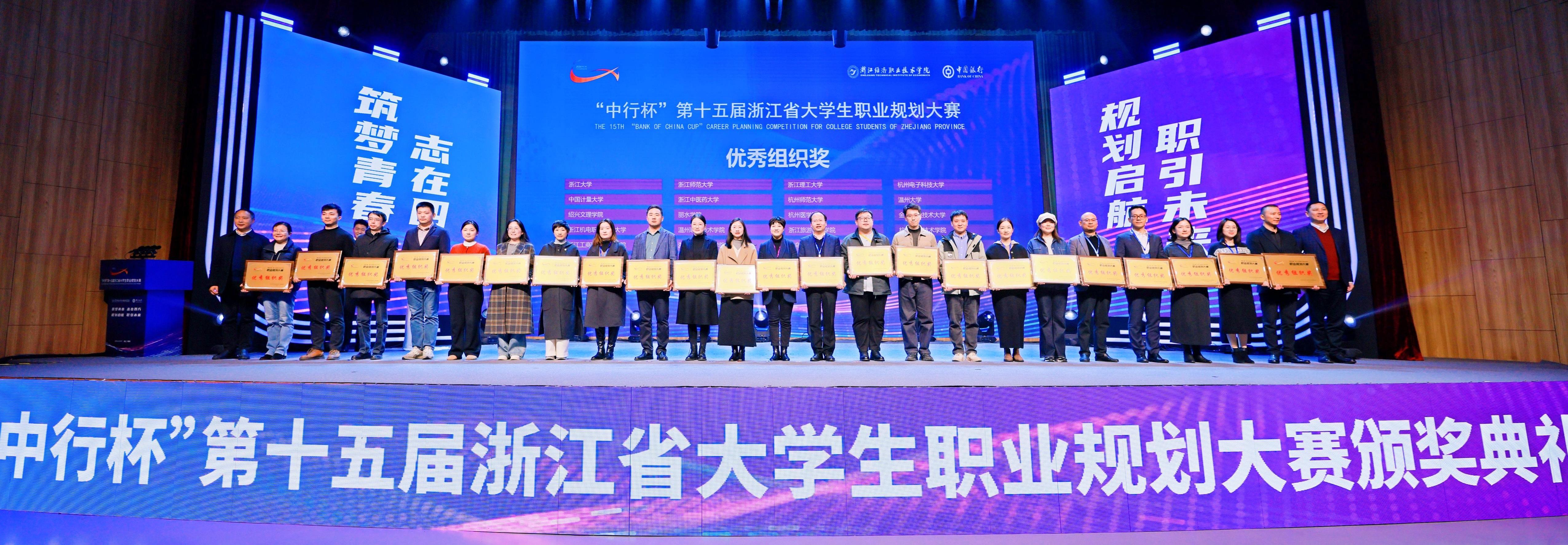 12月27日,“中行杯”第十五届浙江省大学生职业规划大赛圆满落下帷幕。本次大赛由浙江省教育厅主办,浙江省教育发展中心和浙江经济职业技术学院承办,共有105所高校869名选手参加省赛复赛。经过激烈角逐,我校共获金奖2项、铜奖2项、优胜奖2项,郑吟、章蔓丽、孙延泽、林政4名指导老师荣获优秀指导教师奖,学校喜获优秀组织奖,再创我校省赛最佳成绩。