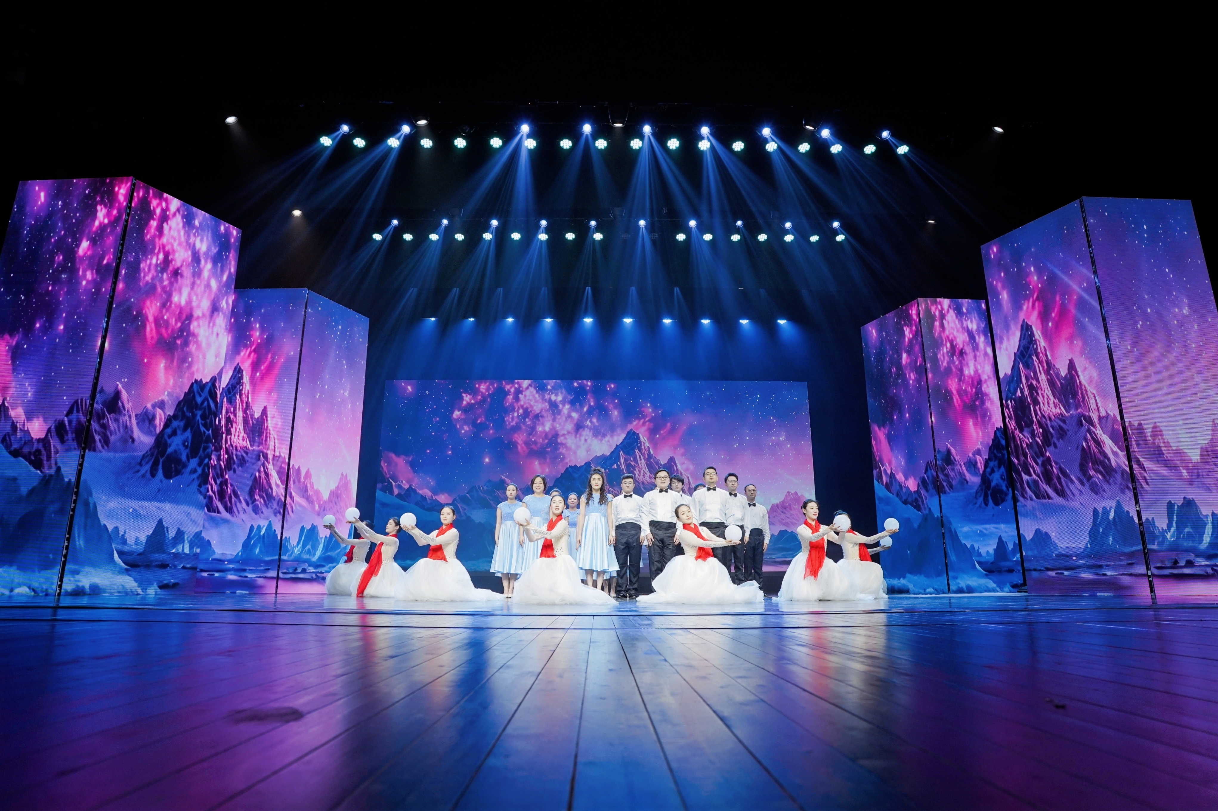接到此次校企合作的邀请后,教学实践中心便积极开展筹备,就演出内容、演出形式、节目编排、舞美设计以及灯光、服装、道具等相关细节进行了充分讨论,寒假期间主创团队各个岗位的老师加班加点与华云信息科技有限公司充分沟通磨合,合力打造了一场高质量的文艺演出。