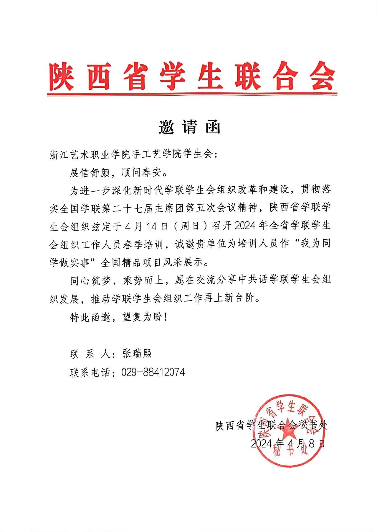 4月14日,手工艺学院学生会受陕西省学生联合会邀请,线上参与“我为同学做实事”全国精品项目风采展示,在交流分享中共话学联学生会组织发展,推动学联学生会组织工作再上新台阶。
