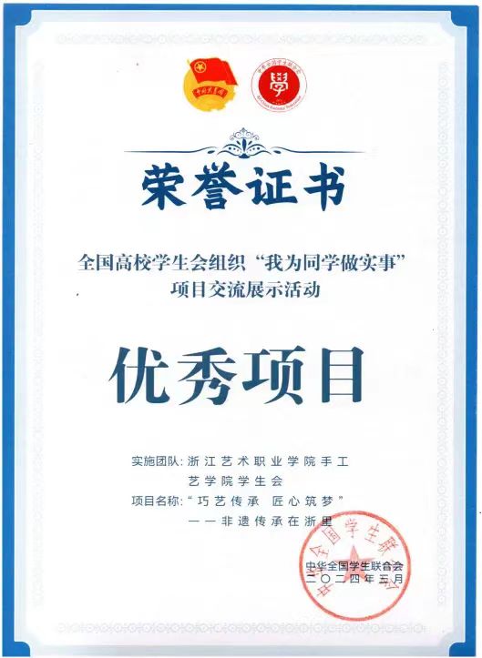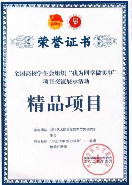 此前,由全国学联举办的首届高校学生会组织“我为同学做实事”项目,手工艺学院学生会“巧艺传承 匠心筑梦——非遗传承在浙里”项目获评全国高校学生会组织“我为同学做实事”优秀项目并入围全国交流展示活动,全国共入选300个。经现场答辩,获评全国高校学生会组织“我为同学做实事”精品项目和“最受同学欢迎”项目,全国分别共有100个项目获评。