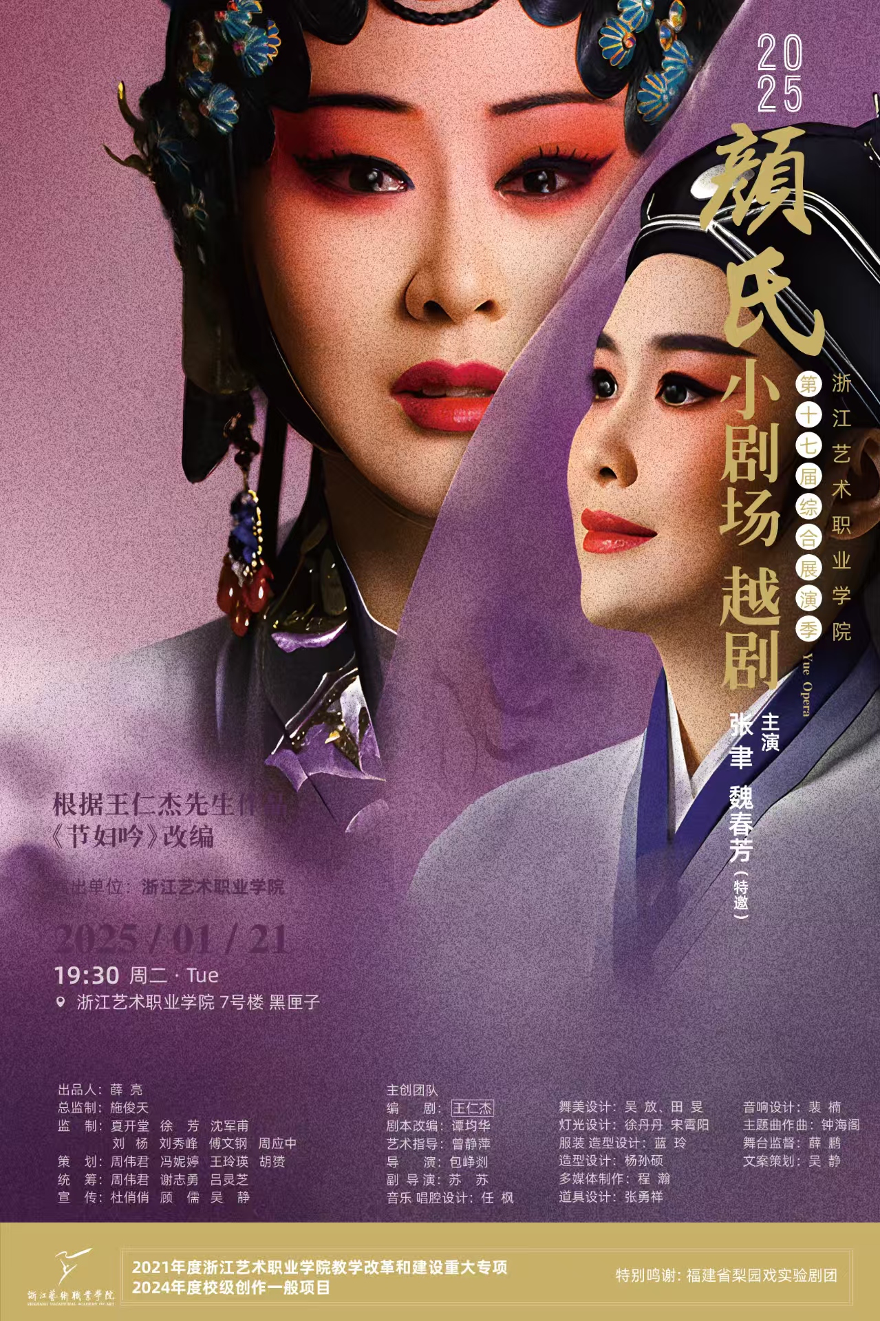 该剧主创阵容由校企双向师资团队集结而成,浙江省舞台艺术“1111”人才、我校舞蹈学院副院长包峥剡担任导演,戏曲学院剧目声腔教研室主任苏苏担任副导演,欧阳予倩戏剧奖最佳演出设计获得者、设计学院舞美教研室主任吴放担任舞美设计,中国舞台美术年展金奖获得者、教学实践中心教师徐丹丹担任灯光设计,“颜氏”一角则由该项目负责人、一级演员、戏曲学院教师张聿扮演。此外项目组还特邀一级舞美设计蓝玲担任服装造型设计,浙江小百花越剧院一级演员魏春芳扮演男主角“沈蓉”一角,编剧谭均华作剧本改编,作曲家任枫担任唱腔音乐设计,青年造型师杨孙硕担任造型设计。此次《颜氏》的排演是对于学校创作团队的一次专业检验,也是对学校创作作品产教融通的一次大胆尝试。