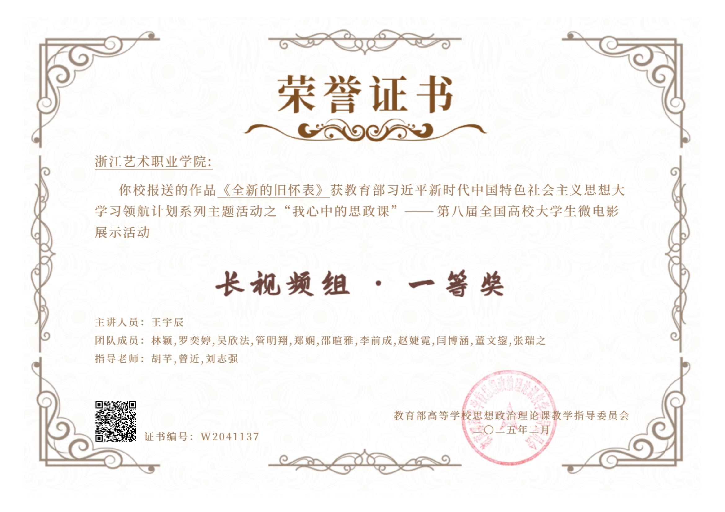 “我心中的思政课”——第八届全国高校大学生微电影展示活动中,在马克思主义学院教师胡芊、曾近、刘志强指导下,由我校王宇辰、林颖、罗奕婷、吴欣法、管明翔、郑娴、邵暄雅、李前成、赵婕霓、闫博涵、董文鋆、张瑞之组成的学生团队创作的微电影作品《全新的旧怀表》斩获全国一等奖,浙江省第一名。