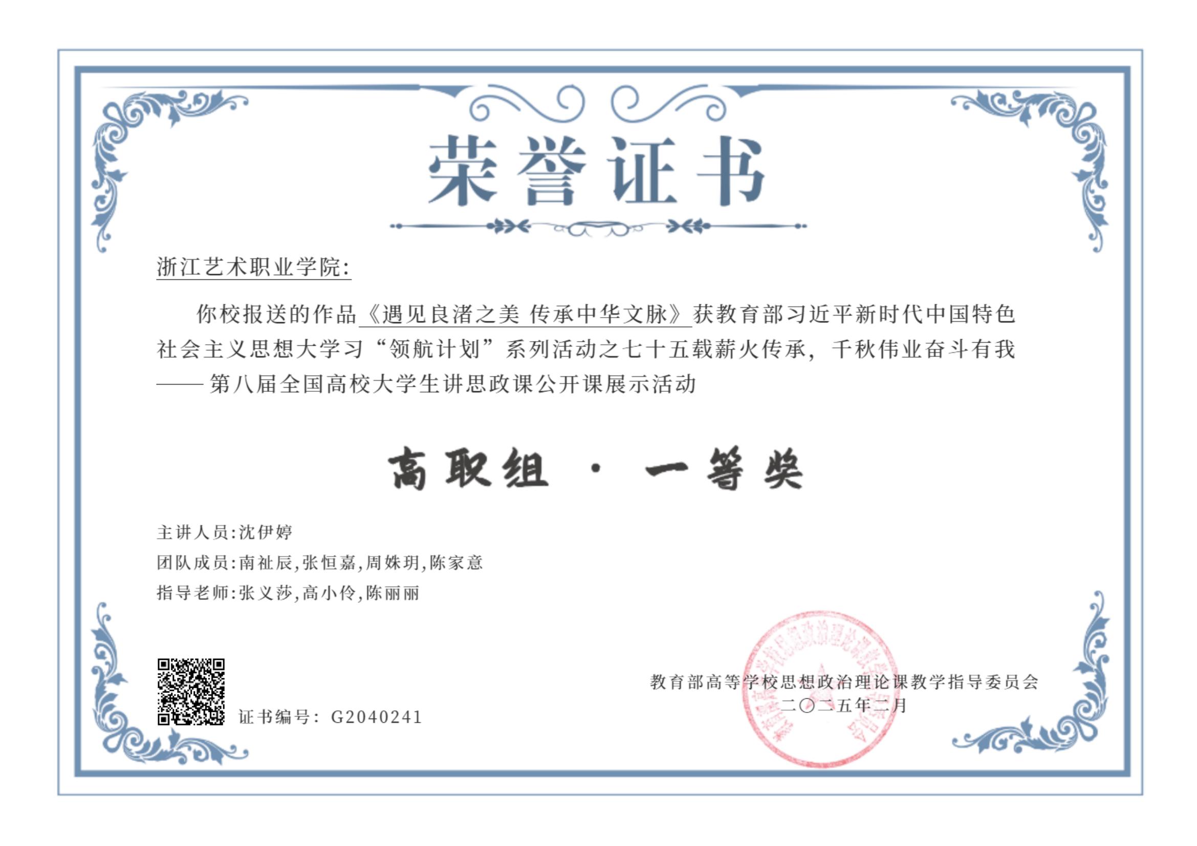 “七十五载薪火传承,千秋伟业奋斗有我”——第八届全国高校大学生讲思政课公开课展示活动中,在马克思主义学院教师张义莎、高小伶、陈丽丽指导下,由我校沈伊婷、南祉辰、张恒嘉、周姝玥、陈家意组成的学生团队讲授的作品《遇见良渚之美  传承中华文脉》斩获全国高职组一等奖。