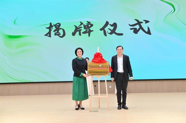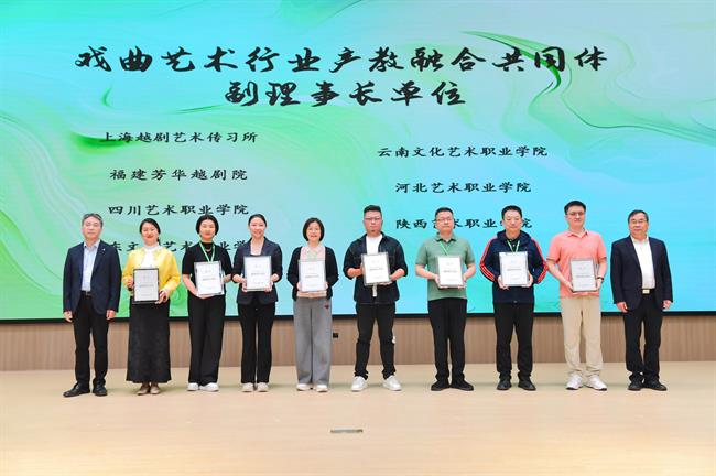 在热烈的掌声中,与会领导嘉宾共同上台,完成了戏曲艺术行业产教融合共同体的成立仪式,并为首届理事长单位、副理事长单位授牌。
