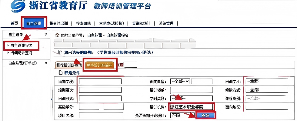 1)请各位老师在08:00-21:00之间登录(用师训账号登录)浙江省教育厅培训管理平台进行选课。报名完成后及时提醒学校管理人员对您的报名进行审核确认,并随时关注自己报名的审核情况,直至报名成功。如果第一轮选课未成功,请及时参加第二轮选课;